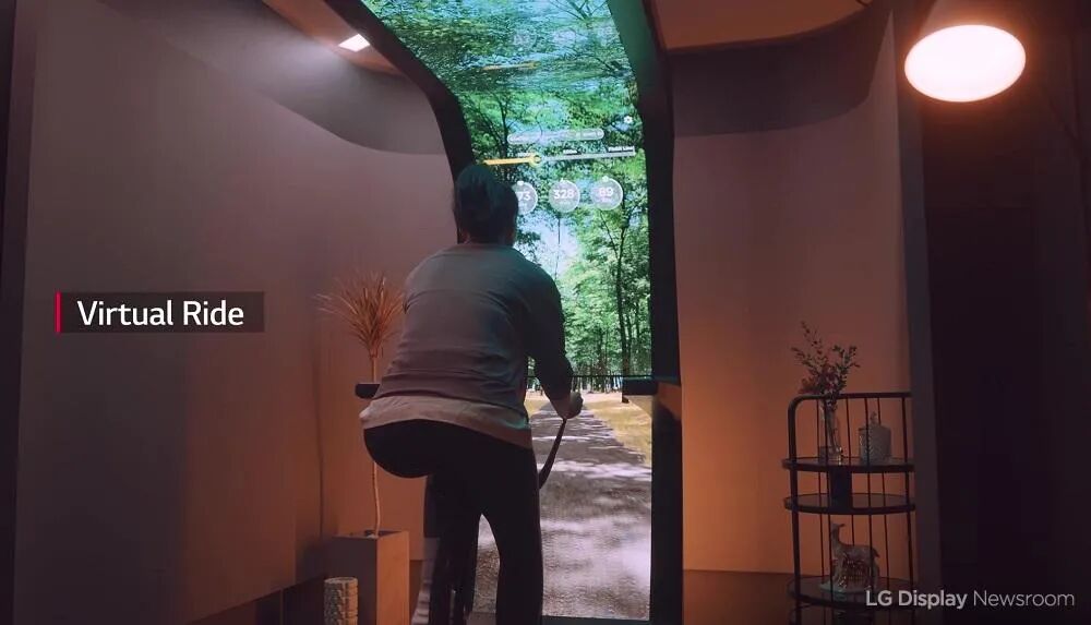 LG Display展示了集健身娛樂于一體的騎行設備——Virtual Ride。這款設備由三片55英寸OLED大尺寸屏幕拼接而成,屏幕與運動器材結合在一起,讓用戶體驗到在戶外騎行般的沉浸感。
