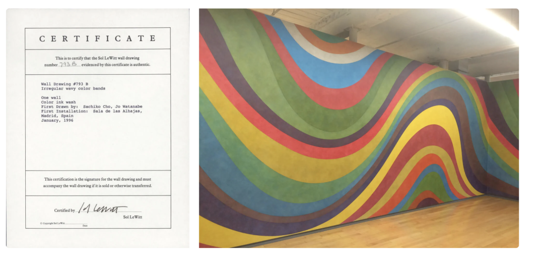 雖然這是一種兩極分化的范式,但它并不完全新穎,在分發和獲取概念作品時也存在類似的想法,例如 Sol LeWitt 的壁畫。在這些情況下,“擁有”和轉讓的東西(由收藏家、博物館、機構獲得)可能只是簽名的真品證書。我們可以通過類似的方式看到加密藝術:分發和交易的代幣不是文件,而是更類似于藝術家簽名的真實性證書,每個證書都與特定的媒體、藝術品或想法有一些概念上的聯系。