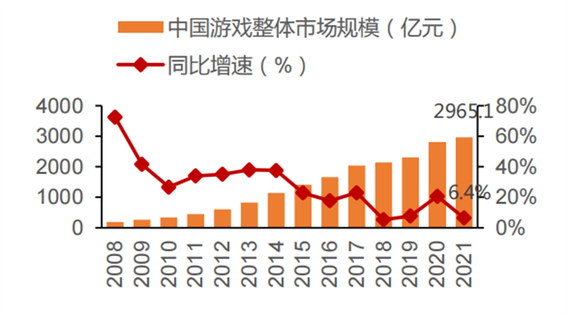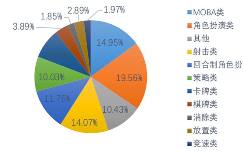 中國游戲產業處存量博弈階段,角色扮演類游戲在市場收入方面居于首位。2021 年中國游戲市場實際銷售收入 2965.13 億元,yoy+6.4%。2021 年中國游戲用戶規模 6.66 億,yoy+0.22%,用戶數量漸趨飽和。2021 年中國移動游戲收入排名前 100 位產品中,角色扮演、卡牌、策略三類游戲占據半壁江山,表明了玩家的偏好,以及企業相對集中的市場供給;此外,角色扮演、多人在線戰術競技和射擊三類游戲占總收入 50%以上,反映這三類游戲用戶基數較大的客觀現實。