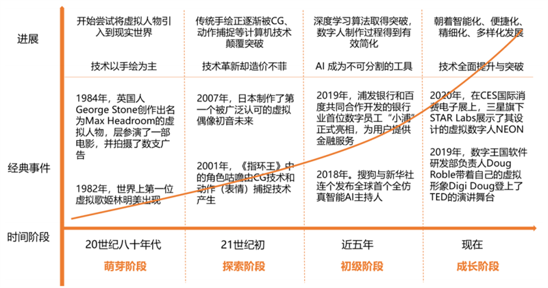 對于不要求必須具備交流互動能力時,數字人、虛擬人、虛擬數字人這三者概念可以認為是等同的。但在嚴格意義下它們又有細微的差別。虛擬人的身份是虛構的,現實世界中不存在的。數字人強調角色存在于數字世界。虛擬數字人強調虛擬身份和數字化制作特性。虛擬數字人從最早的手工繪制到現在的 CG(Computer Graphics,電腦繪圖)、人工智能合成,虛擬數字人大致經歷了萌芽、探索、初級和成長四個階段。