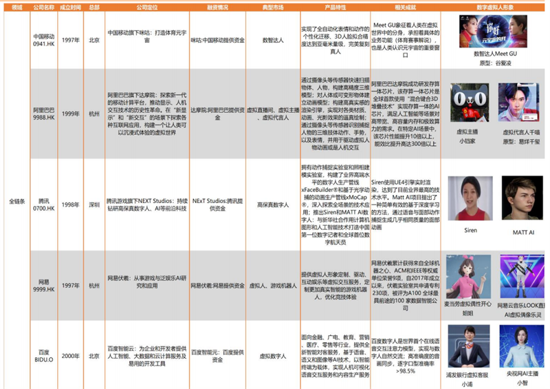 國內廠商在產業鏈基礎層、平臺層和應用層發展較為均衡,虛擬數字人從開發到落地的體 系逐漸趨于完整。基礎層相關廠商主要著力點在人工智能、動作捕捉、建模渲染以及虛擬數字人的技術服務。科大訊飛、捷成股份、新華網、標貝科技、追一科技和小冰等專注人工智能,云舶科技專研動作捕捉,環球墨非、億真科技、虛谷未來科技、半人貓、疊鏡數字、相芯科技以及 Tatame 等專注建模渲染,中科深智、魔琺科技和萬像文化等負責虛擬數字人的技術服務。產業鏈平臺層建設為虛擬數字人運營,主要包括虛擬數字人的外觀設計、包裝、宣傳、落地和培養,相關企業有上海禾念、樂華娛樂、動圖宇宙、次世文化、創壹視頻、虛擬影業、魔塔時空和世悅星承等。應用層主要投入在游戲、直播、動畫、影視、音樂以及社交平臺等,應用于娛樂和營銷。騰訊音樂、芒果超媒、奧飛娛樂和嗶哩嗶哩等將虛擬主播和虛擬偶像等應用于娛樂內容。藍色光標、浙文互聯、引力傳媒、星期六(遙望網絡)、華揚聯眾和天下秀等已推出或籌備推出虛擬 IP 形象,著重廣告營銷,星期六(遙望網絡)預計推出虛擬數字人與真人的互動直播。中國移動、阿里巴巴、騰訊、百度、網易等綜合型廠商支持旗下相關公司或事業部向虛擬數字人賽道發力。