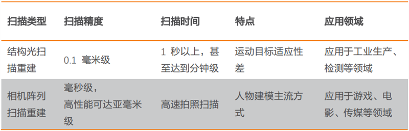 虛擬數字人基礎技術架構包括“五橫兩縱”。“五橫”是指用于數字人制作、交互的五大技術模塊,即人物生成、人物表達、合成顯示、識別感知、分析決策等模塊。其中,人物生成,即人物建模方面 2D 數字人較為簡單,3D 數字人需要額外使用三維建模技術。人物表達包括語音生成和動畫生成。動畫生成則包含驅動和渲染兩大部分。“兩縱”是指 2D、3D 數字人,2D 數字人和 3D 數字人在技術架構方面基本一致。3D 數字人需要額外使用三維建模技術生成數字形象,信息維度增加,所需的計算量更大。建模技術分為靜態掃描建模和動態光場重建,目前主流技術仍為靜態掃描,相比靜態重建技術,具有高視覺保真度的動態光場三維重建技術不僅可以重建人物的幾何模型,還可一次性獲取動態的人物模型數據,并高品質重現不同視角下觀看人體的光影效果,成為數字人建模重點發展方向。靜態掃描建模技術可分為結構光掃描重建和相機陣列掃描重建,結構光掃描重建掃描時間長,對于人體這類運動目標在友好度和適應性方面都差強人意,更多的應用于工業生產、檢測領域。相機陣列掃描重建替代結構光掃描重建克服了以上問題成為人物建模主流方式。隨著拍照式相機陣列掃描重建得到飛速發展,目前可實現毫秒級高速拍照掃描(高性能的相機陣列精度可達到亞毫米級),并成功應用于游戲、電影、傳媒等行業。