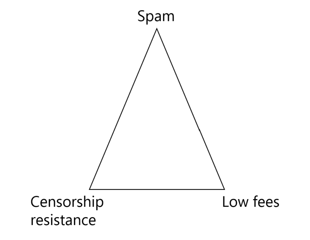 針對這一問題,也有網友效仿區塊鏈「可擴展性」的「不可能三角」,提出了「交易質量」的選擇困境:交易泛濫(spam)、抗審查性(censorship resistance)和低費用(low fees)三者之間,實現其二,剩下的另一目標就必定不能實現。