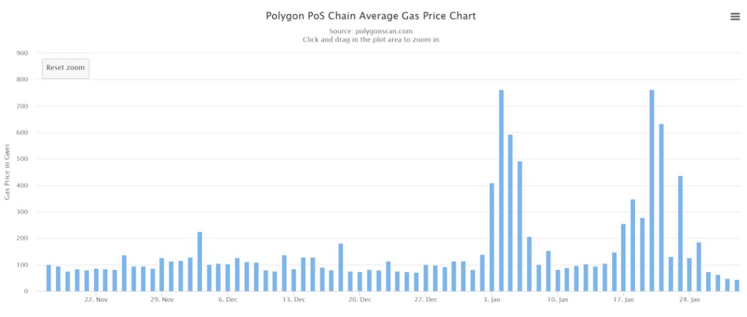 Polygon長期為「交易泛濫」所困,網絡擁堵現象不時發生。此前在去年10月,Poygon已經將節點客戶端的最低 gas 價格調高30倍(由1 Gwei 調至30 Gwei),以應對海量的「垃圾交易」。