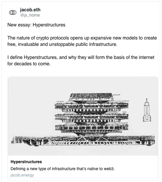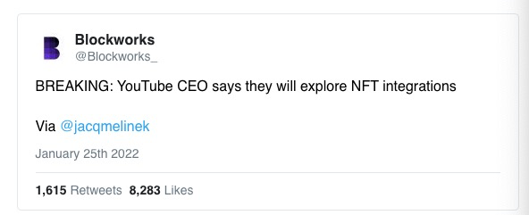 - YouTube首席執行官蘇珊·沃西基(Susan Wojcicki)提到,該公司正在考慮將YouTube的服務范圍擴大到“NFT類內容”。- 隨著美國國稅局(IRS)的最后報稅期限臨近,Coinbase推出了一個免費稅務中心……雖然來的有點慢,但還好沒缺席。- Paradigm分享了一篇關于CRISP的文章,即“固定速率發行銷售協議”,該協議的目標是在一段時間內以目標速率出售NFT。- PartyDAO引入了收藏方。你可以在任何NFT收藏中開始一個聚會,收集ETH,然后在合適的時間購買任何你想要的道具。- Gem.xyz在第一周就有10k ETH的銷量。- LooksRare的新更新:當從任何你的收藏中交易LooksRare上的NFT時,將獲得$LOOKS交易獎勵。- Coinbase宣布Shopif的首席執行官加入了他們的董事會。