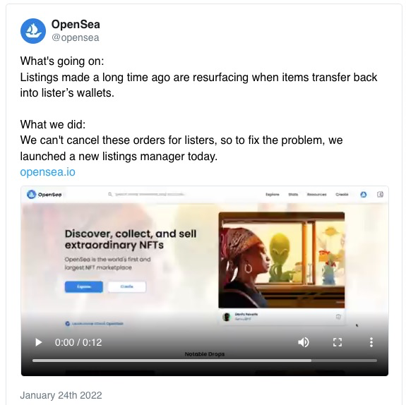 - CoolPets今天發布,每只0.5 ETH。- Nifty 's推出了“精選藝術家”(Featured Artists)系列,這是一組來自全球各地的創作者們精心策劃的作品,塑造了NFT的景觀。- 一名名為jpegdegenlove的用戶花了57.31 ETH(13.7萬美元)購買了兩只Bored Apes,兩只Mutant Apes,一只Cyberkongz Genesis和一只Cool Cat,但由于代碼中的一個漏洞,這些資產很快就以390 ETH (936K美元)的價格出售了。由于代碼中的這個問題,OpenSea正在補償那些以低于市場價出售NFT的用戶。- Slingshot 2099,一個新的Polygon NFT市場。- Oasis是一個由StarkNet支持的新型NFT交易市場,你可以在這里部署自己的ERC721合同并交易NFT。
