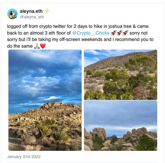 原文鏈接:https://nftimes.substack.com/p/issue-29摘要:Google顯示NFT搜索量已經超過crypto等詞匯。披頭士樂隊NFT大甩賣。還有好幾位高管從傳統大廠跳槽加密世界。我周末去Joshua Tree遠足了。那里沒有網絡,沒有wifi,沒有電腦。我知道我們都“期待”著整天都在電腦上查看Twitter,刷新新聞,并在Discord上查看#公告。但我必須說,我非常感謝我們在任何一個地方所做的一切。看到大自然讓我享受我在一周中的工作,工作又讓我享受周末的旅行或徒步旅行。我強烈建議你在家里做一些事情,做一些讓你開心并且不需要盯著屏幕的事情。