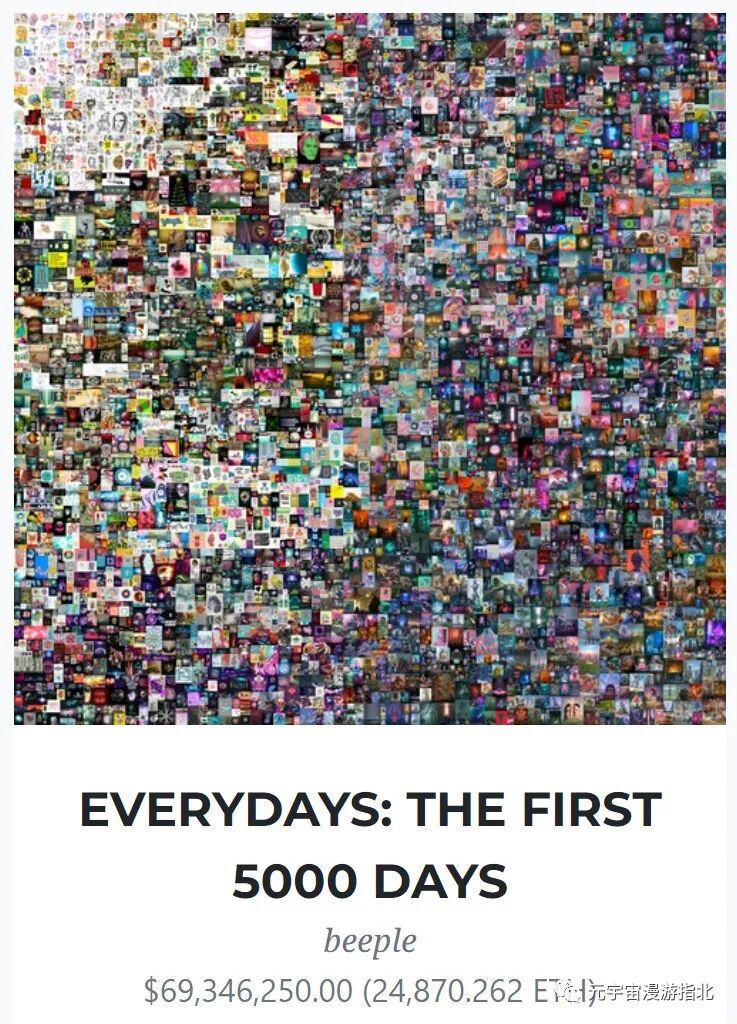 2021年的3月11日,Beelpe的Everydays:THE FIRST 5000 DAYS,在佳士得拍賣成交了6930美元,這幅畫記錄著Beeple從2007年5月1日開始,每天都會在Instagram發布的作品,幾乎不間斷的日更5000天,包含老婆生孩子的那一天也沒有斷更。