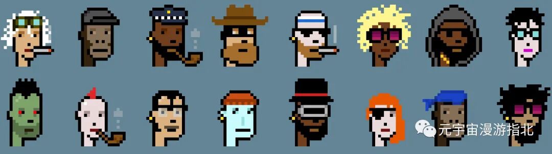 2017年,Larvalabs發布了Cryptopunks,24 x 24的像素生成藝術品,算法生成,總量10000,大多數都是看起來很笨拙的男孩和女孩,但也有一些比較罕見的類型如猿、僵尸,甚至是奇怪的外星人。