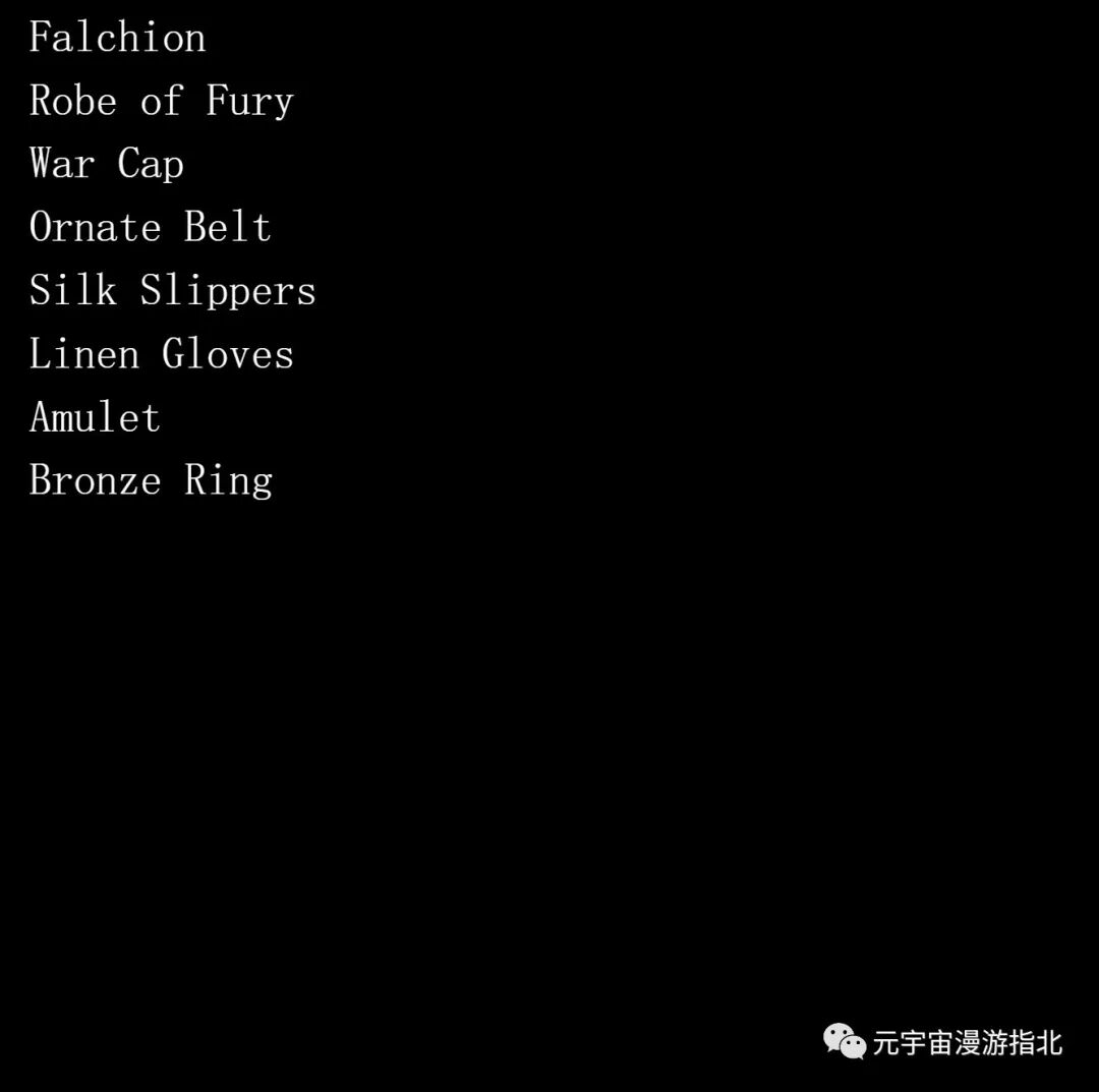 8行字,代表著八種冒險者的裝備,包含武器、頭盔、盔甲、腰帶、手套、靴子、項鏈、戒指,僅此而已。