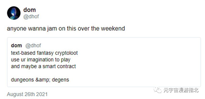 DOM,Vine(短視頻的創始人)發了一條推特,有人想要玩這個嘛?基于文本幻想的CryptoLoot,發揮你的想象力過來玩,也許是只能合約。
