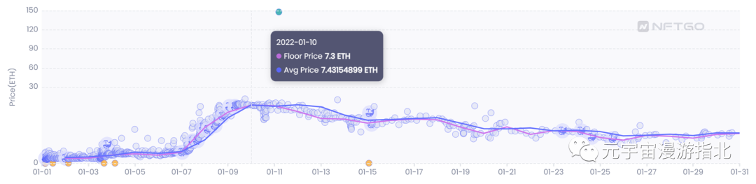 小編簡評:團隊有周杰倫,畫面一般,資本很強,34個巨鯨持有,未來如何看周杰倫。1月1日上市,花了一天mint完,到了7號慢慢地板價升至0.8,1月7日開始兩天被神秘的力量拉到了歷史最高點7.2ETH,然后一路過山車到1月底的2ETH。