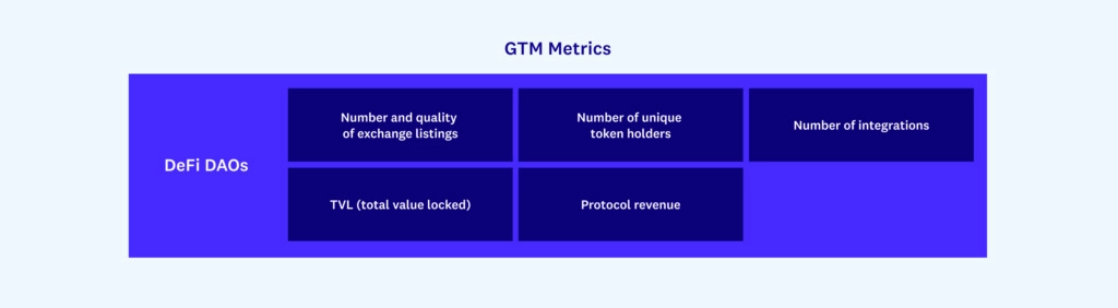 那么這里的 GTM (進入市場) 策略是怎樣的呢?以 DAI 為例,該算法穩定幣由 MakerDAO 發行和治理。像 MakerDAO 這樣的大多數算法穩定幣發行者的一個目標是讓他們的穩定幣在金融生態系統中得到更多的使用。因此,其 GTM (進入市場) 的舉措是:1) 在加密貨幣交易所上市,用于散戶和機構交易;2) 整合到錢包和應用中;3) 接受用于支付商品或服務。如今,DAI 市場已經超過 400 個 (包括交易所、DeFi 應用等),同時被整合到數百個項目中,并通過 Coinbase Commerce 等主要商業解決方案被接受為一種支付形式。他們是怎么做到的?MakerDAO 最初是通過一個更傳統的業務開發團隊實現這一點的,這個團隊推動了許多早期的合作和集成。然而,隨著去中心化程度的增加,MakerDAO 社區成立 Growth Core Unit,致力于通過戰略合作伙伴關系和業務發展,持續發展 DAI 穩定幣和 Maker 協議,這是 Maker 代幣持有者的子社區 (subDAO)。此外,由于MakerDAO 是去中心化的,其協議的操作是無須信任和無須許可的,任何人都可以使用該協議生成或購買 DAI。DeFi DAO 的 GTM 策略:隨著 web3 新的 GTM (進入市場) 策略的出現,也出現了衡量成功的新方法。對于 DeFi 應用來說,典型的成功指標是前面提到的總鎖倉價值 (TVL)。它代表了用于使用某個協議或網絡來進行交易、質押或借貸的所有資產。然而,TVL 并不是衡量長期的組織健康和成功的理想指標。盡管新的 DeFi 協議可以通過復制既有協議的開源代碼,并提供高收益,從而吸引大量的資金流入和 TVL,但這并不一定具有用戶粘性——交易者通常在下一個項目出現時就會離開。因此,要跟蹤的更關鍵的指標是諸如唯一代幣持有者的人數、社區參與頻率和情緒、開發者活動。此外,由于協議是可組合的——即可以被編程來相互交互和構建——另一個關鍵指標是集成,集成的數量和類型可以追蹤到協議在其他應用 (如錢包、交易所和產品) 中如何和在何處使用。