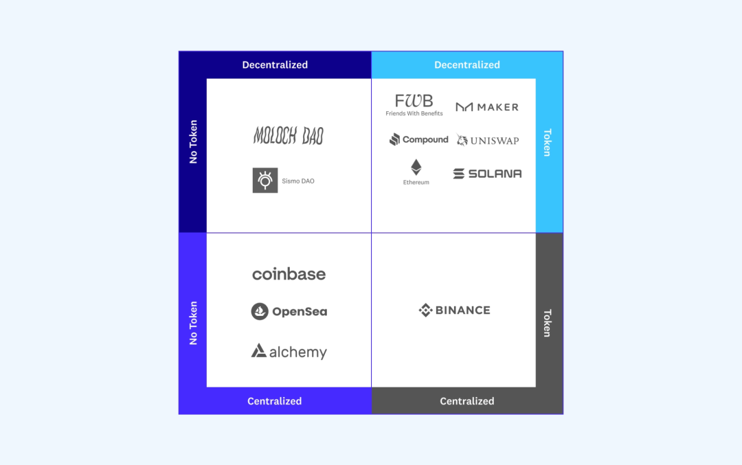 對于 Web3 組織而言,根據其組織結構 (中心化 vs 去中心化) 和經濟激勵 (沒有 Token vs. 使用 Token),其 GTM (進入市場) 策略取決于該組織在下圖矩陣中的位置:![]()