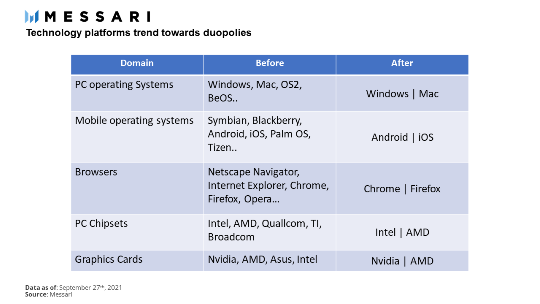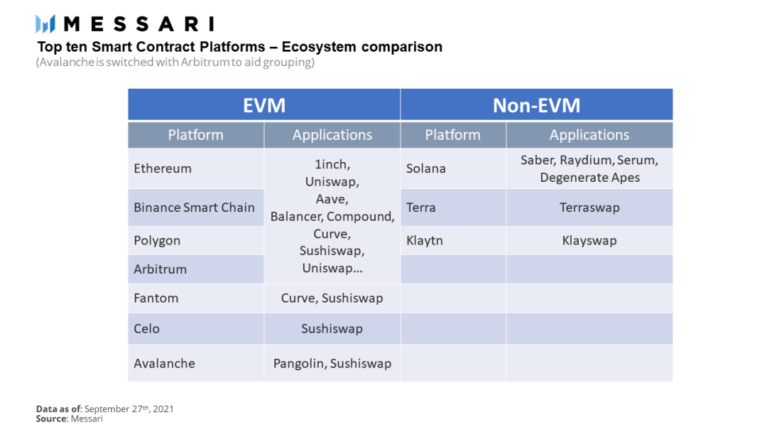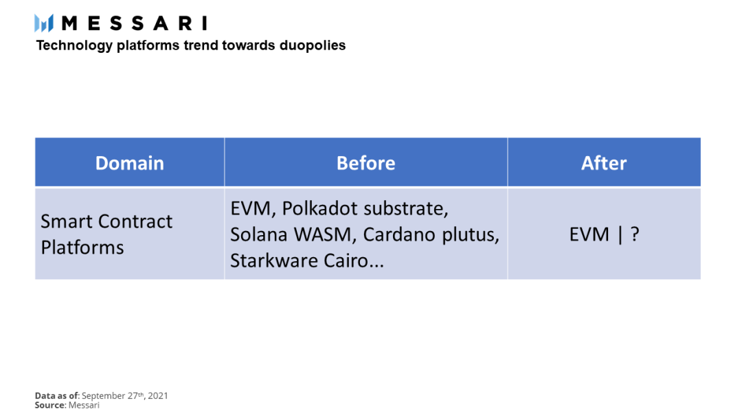 上圖:TVL 排名前十的智能合約平臺中,兼容 EVM 的平臺 (左) 和不兼容 EVM 的平臺 (右) 各自的頂級生態系統 dApps。制圖:Messari上表似乎表明,如果你在搭建新的智能合約平臺時選擇不兼容于 EVM,那么你注定遭遇碎片化。相反,如果選擇兼容 EVM 的路線,新興的智能合約平臺顯然能夠爭取到現有的頂級 DeFi 項目,以及使用這些 DeFi 項目的用戶。就不兼容 EVM 的鏈而言,無論它們看起來多么令人興奮,它們都必須重新開始搭建新的項目或者克隆其他產品,并避開其他元老級 DeFi 產品帶來的網絡效應和勢頭。這就引出了我們的下一個問題:從長期來看,市場將支持多少種類型的智能合約平臺?