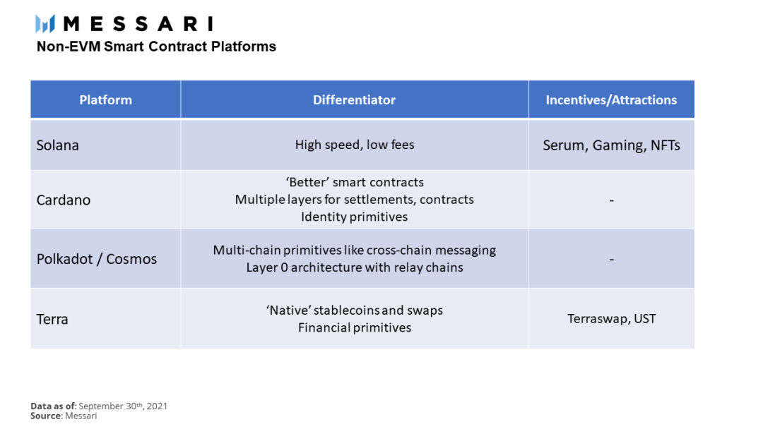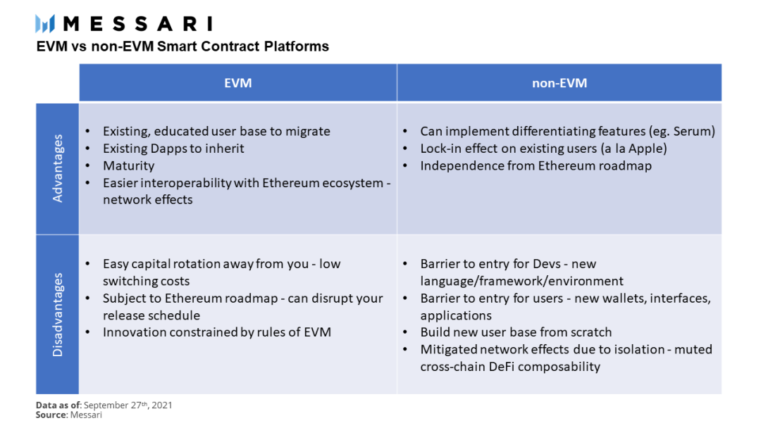 相比之下,不兼容 EVM 的智能合約平臺的優劣勢如下: