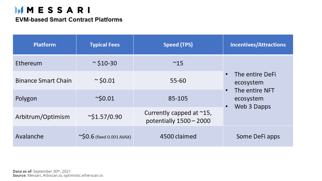 上圖:各大 EVM 智能合約平臺的費用、TPS、激勵/吸引力的對比。基于 EVM 的以太坊側鏈、Rollups 以及其他 L1s 公鏈本質上都是在爭奪相同的 dApps 和用戶。資本流轉很快,如果用戶可以獲得好處,新推出的 EVM 兼容鏈就會獲得用戶的熱情采用。但只要蛋糕仍在增長,這可能就不是一場零和游戲。這個行業還很年輕,只要 EVM 兼容鏈能夠在費用和性能方面具有競爭力,同時以激勵的方式來吸引用戶帶來并留下來,那么就有可能幸存下來。在 EVM 宇宙中,差異化是一件微妙的事情:與其他兼容 EVM 的 L1s 公鏈相比,以太坊 Rollups 聲稱有著更好的去中心化程度,但市場尚未對此給出溢價。隨著更多的互操作性協議上線,跨平臺結構有著很大潛力。比如,在某條 EVM 兼容鏈上提供抵押品,并在另一條 EVM 兼容鏈上進行貸款,這將擴展整個經濟的可用性。這一領域很可能將是一個開放的市場,多個平臺爭奪用戶的注意力——就像 Windows PC 市場一樣。