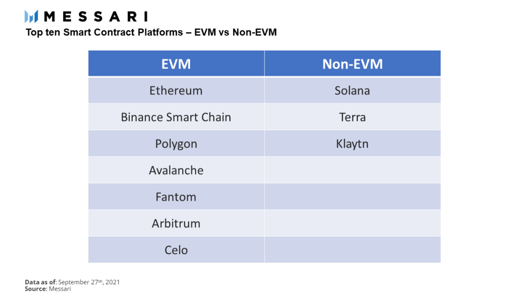 然而,正如 Messari 分析師 Ryan Watkins 在最近一篇有關「智能合約平臺之戰」的文章中所指出的,價格并不代表一切。如下圖所示,以 TVL (總鎖倉價值) 衡量,這些平臺的實際活動與 Polygon 等兼容于 EVM (以太坊虛擬機) 的以太坊側鏈相比還相差甚遠,而 Polgyon 的價格僅為其新競爭對手的一小部分。上圖:總鎖倉價值 (TVL) 排名前十的智能合約平臺,數據截至2021年9月27日像 BSC (幣安智能鏈) 和 Polygon 這樣的市值相對較高的以太坊側鏈,是如何強有力地維持著“真實的”用例的?初來乍到的 Arbitrum 又是如何快速地在 TVL (總鎖倉價值) 方面擠進前十的?它們之間有何共同之處?上圖:TVL 排名前十的智能合約平臺中,兼容于 EVM 的平臺 (左) 和不兼容 EVM 的平臺 (右)。截至撰文時,TVL 排名前十的智能合約平臺中,有 70% 的平臺是兼容于 EVM,30% 不兼容!EVM 是運行智能合約的“虛擬機”,最初在以太坊上,現在已經在一系列新興的以太坊側鏈和 L2s 網絡上兼容。你可以將 EVM 想象成 Android (安卓) 操作系統 —— 使用安卓系統的手機 (不管是 Google 手機還是其他安卓手機) 都能夠運行你最喜歡的一些 Apps。為什么這個細節在評估智能合約平臺時至關重要呢?誰會在乎這一點呢?![]()
