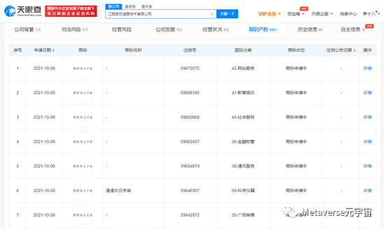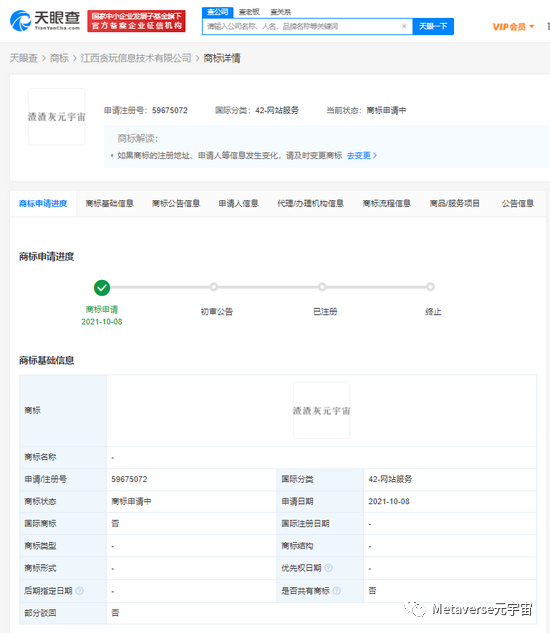 天眼查App顯示,近日,貪玩藍月關聯公司江西貪玩信息技術有限公司申請注冊“渣渣灰元宇宙”商標,國際分類涉及網站服務、教育娛樂等,目前商標狀態均為申請中。