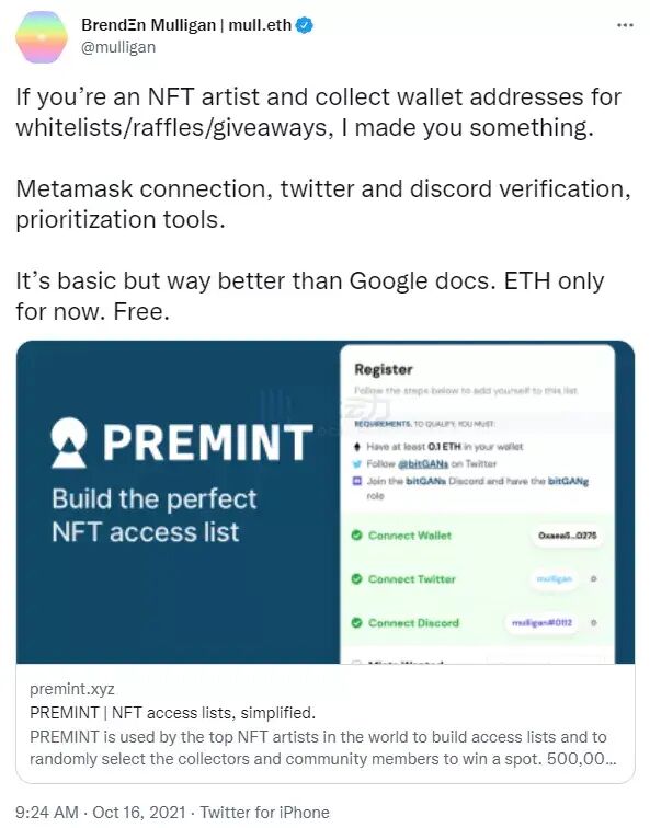 去年 10 月 16 日,Premint 的創始人 Brenden Mulligan 在他的個人推特上發布了關于 Premint 的第一條推文,「它只有基礎功能,但比 Google 文檔好得多。」原本產品的定位就是一個 Web3.0 抽獎工具,它解決了當時市場上 NFT 玩家和項目方抽獎/驗證不方便的痛點。