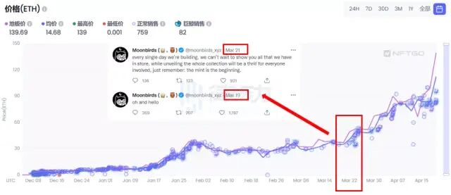 PROOF Collective NFT 是 Kevin Rose 創辦的社區通證,持有者可以享有社區內的各項權益。它的地板價自 2 月初以來一直在橫盤整理,維持在 30 ETH 左右。3 月 19 日,Moonbirds 的官方 Twitter 發布了它的第一條推文,這也按下了 PROOF Collective NFT 價格暴漲的啟動鍵。在隨后一個月的時間里價格一路飛漲,現在的地板價格已經達到了 130 ETH 的天價。