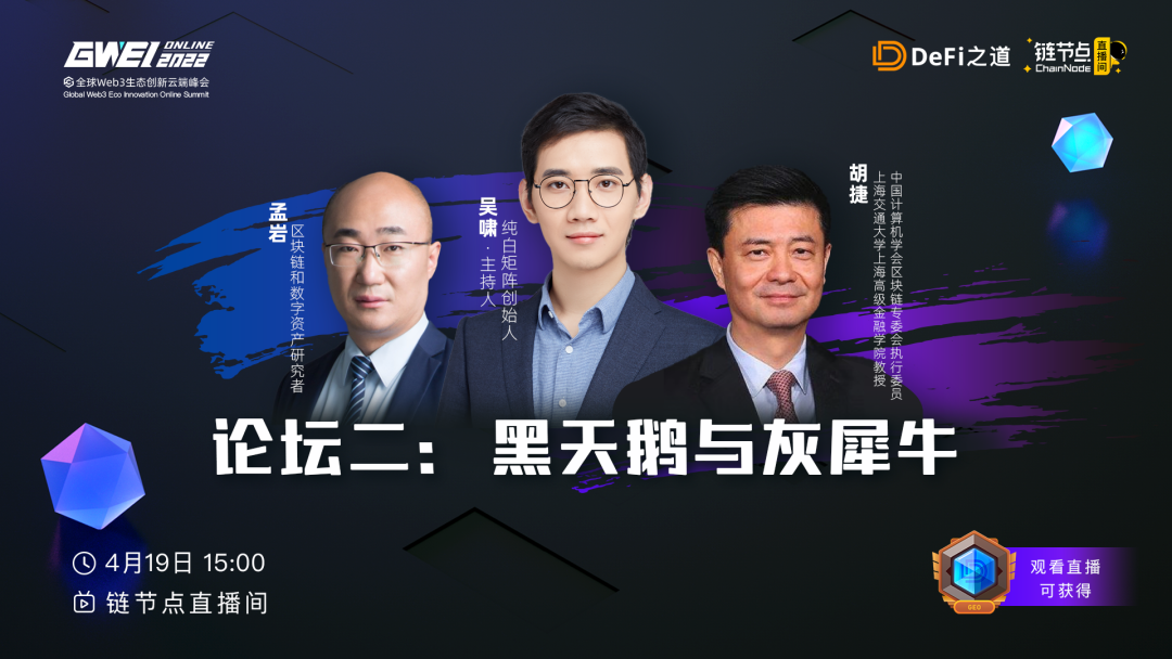 4月19日,GWEI 云端峰會精彩繼續,來自上海交通大學/上海高級金融學院教授、中國計算機學會區塊鏈專委會執行委員胡捷、區塊鏈和數字資產研究者孟巖以及純白矩陣創始人吳嘯,圍繞「黑天鵝與灰犀牛」議題,就美聯儲加息、市場熱點以及創業者選擇等問題進行了深刻的探討。