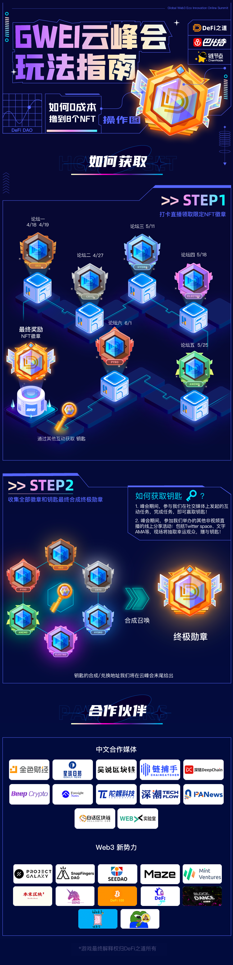 參與論壇視頻直播打卡即可獲取GWEI云峰會每周主題徽章,集齊6枚徽章+鑰匙可合成終極NFT勛章。