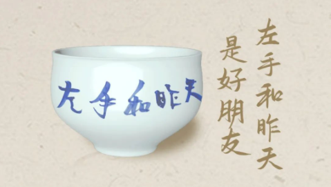 簡介:“左手與昨天是好朋友”瓷碗是邱志杰老師親自制作,并贈與其女兒邱家瓦的禮物。瓷碗側面寫著:左手與昨天是好朋友,寓意著回首過去;而右手向往著明天,通向未來。放下左手回憶過往,激勵我們;抬起右手,昂揚斗志,沖向未來!