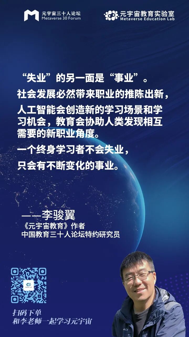 《元宇宙教育》作者、中國教育三十人論壇特約研究員、“育見未來·元宇宙前沿大師課”特邀講師李駿翼老師,針對“智能數字化是否會帶來大規模失業?”的熱點議題提出了看法。他認為,隨著科技的發展和社會的變化,職業必然會推陳出新。但因為教育的存在,每個個體只要保持空杯心態,持續學習,就能保持對社會良好的適應性。教育是幫助人類適應社會變革的最有效的途徑。