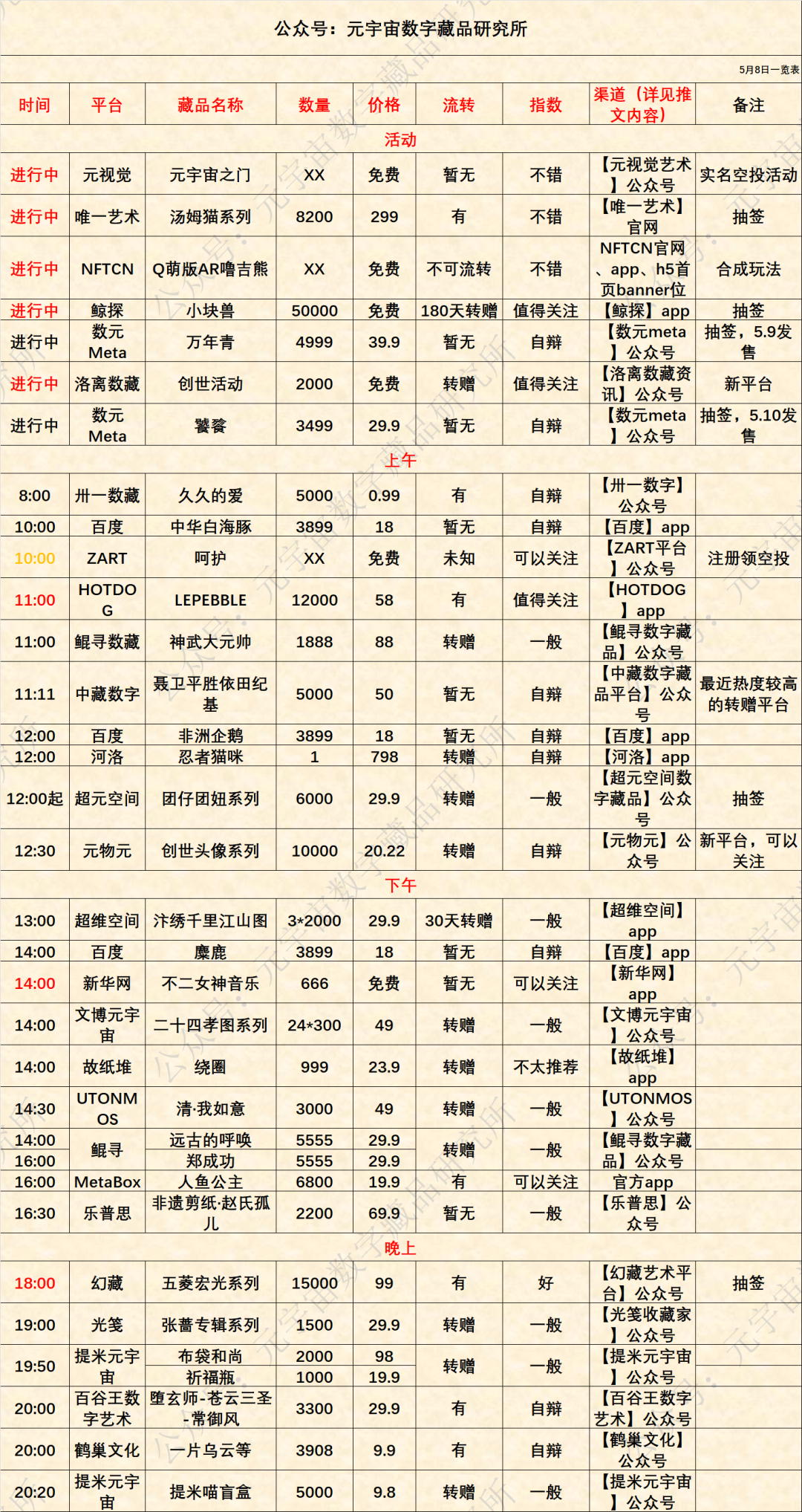 5月8日各平臺數字藏品預告丨現在假期上新也很多了,一覽表記得保存!