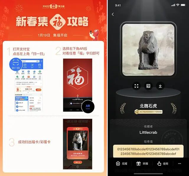 支付寶集五福和21家博物館合作,用戶通過掃一掃,有機會獲得博物館定制的虎文物福卡,集齊傳統的五張福卡后,用戶還可用多余福卡兌換虎文物數字藏品。