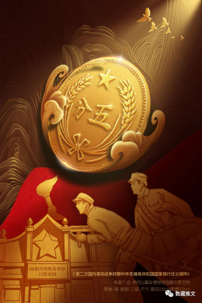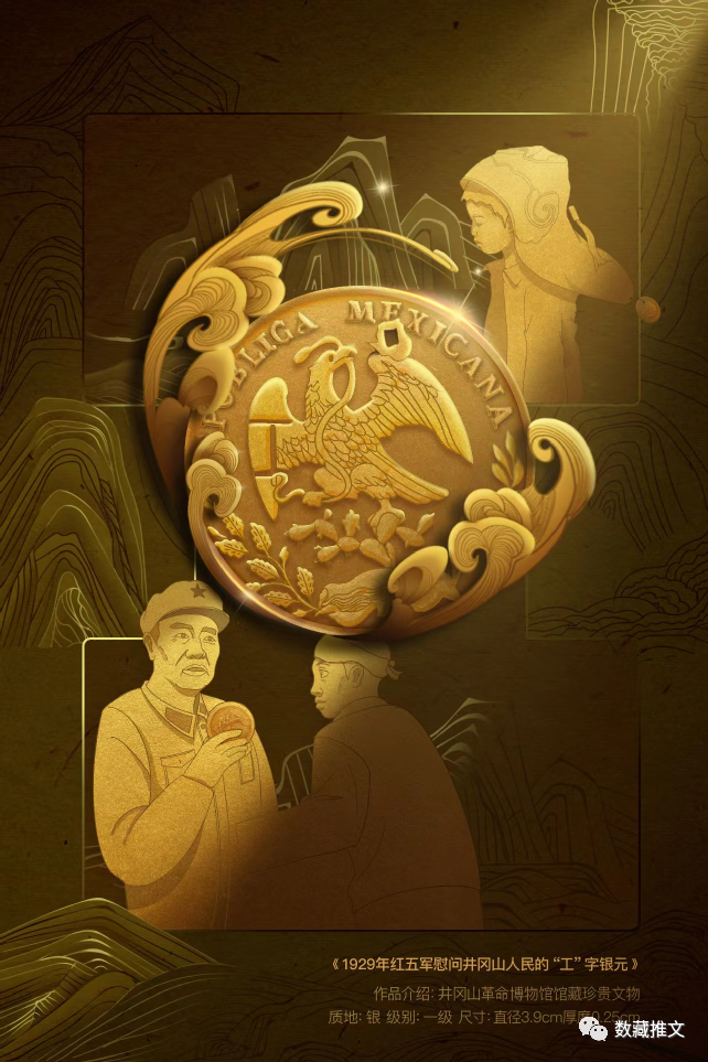 本系列藏品包括3個作品,分別是1929年紅五軍慰問井岡山人民的“工”字銀元、第二次國內革命戰爭時期中華蘇維埃共和國國家銀行伍分銅幣、1932年中華蘇維埃共和國發行的湘贛省工農銀行股票。三款數字藏品,分別包含了十分珍貴、值得緬懷的革命故事。