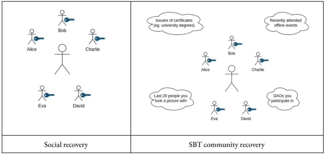 為什么這樣?因為 SBT 會跟蹤你所屬的社區,所以,如果你需要恢復你的“靈魂”,那么 SBT 可用于“利用最廣泛的實時關系來確保安全”,而不僅僅是少數監護人。一些實現機制仍然需要去制定,但這個概念當然是可能實現的。