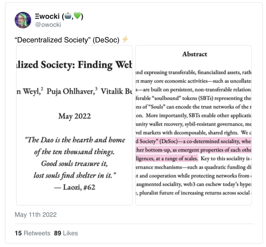 如果繼續下去,DeSoc 還可以為新的產權和治理機制鋪平道路,這些機制“獎勵信任與合作,同時保護網絡免受捕獲、提取和支配。”