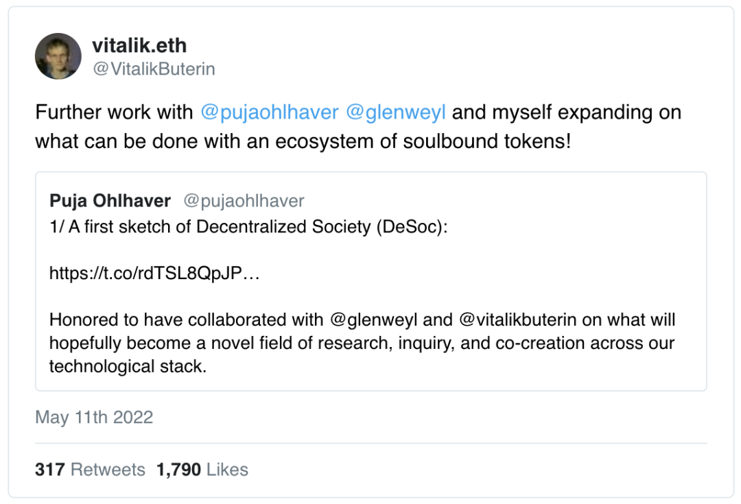 值得注意的是,這篇論文的研究核心是圍繞不可轉讓的“靈魂綁定”NFT的新人文可能性,而 Vitalik Buterin 今年一直在探索這個話題。
