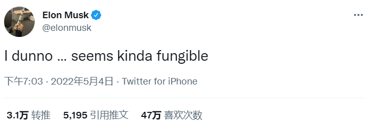 5月4日,特斯拉首席執行官埃隆·馬斯克將他在推特上的個人資料圖片改為無聊猿游艇俱樂部(BAYC)的拼貼畫,并配文”我不知道……似乎有點可替代。“