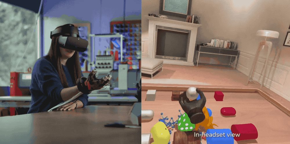 除此之外,研究人員也在嘗試不同的VR手套設計方案。2021年11月,Meta公布了其研發7年的VR觸感手套原型,這款VR手套用微型氣閥取代了電機,通過復雜的控制系統調整手指上的充氣儀器,形成擬真壓力,從而模擬各種觸感。![]()