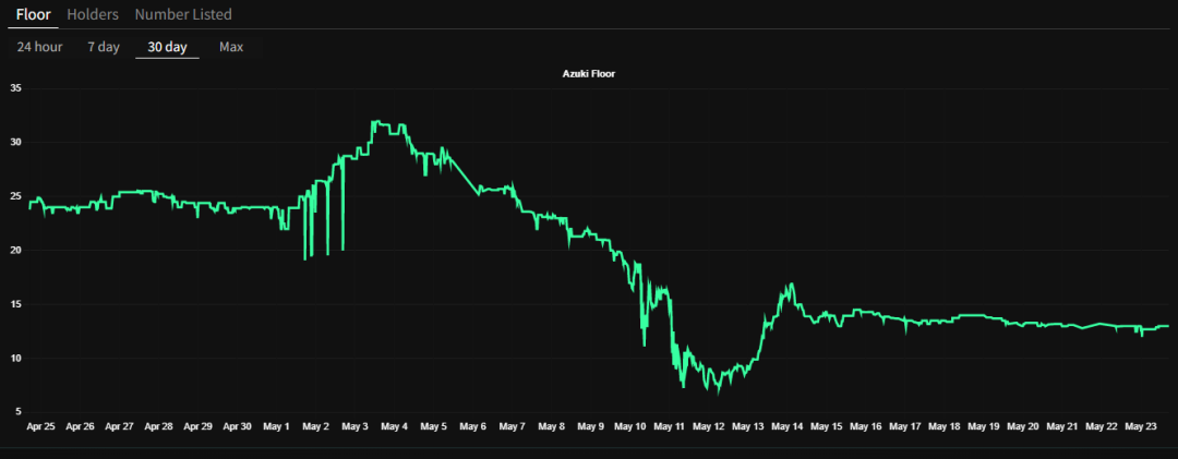 就 Azuki 而言,盡管他們比差不多 8ETH 的地板價上升了將近一倍,但他們仍然正在經歷該項目創始人之一 Zagabond 的「Rug Pull」事件的余波。這是他們近 30 天的地板價: