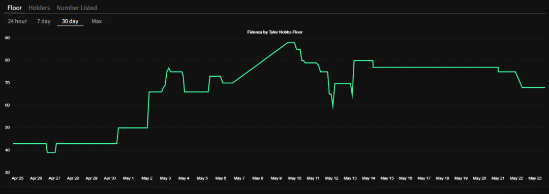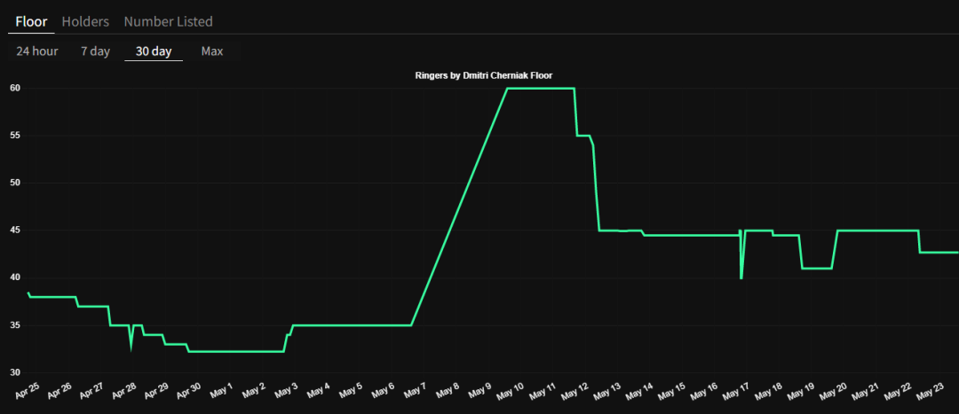 對于 Fidenzas 和 Ringers 來說,這些損失是從上周兩個項目經歷的大規模上漲后的回調,同時也因為其他 NFT 迎來下跌的原因。許多人認為,隨著人們對 NFT 市場大熊市的擔憂加劇,投資者正在把他們的 ETH 從投機性的頭像類 NFT 轉向到如數字藝術品類等更長期的 NFT 中;因此 Fidenzas 和 Ringers 的上漲趨勢如下圖所示:
