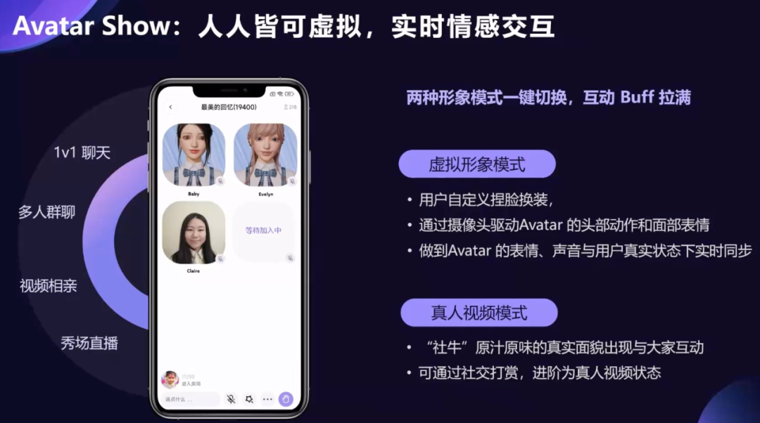 一些平臺面向B端和C端提供基礎的虛擬偶像解決方案,普通人很容易化身二次元面對粉絲。B站上公開的live 2d模型,價格從幾百到上萬不等,而不少平臺都有免費的面部捕捉技術可供利用。也就是說,普通人在有電腦的前提下,最低花幾百元就可以開啟虛擬主播之路。前不久,聲網公布了MetaLive元直播解決方案,為主播有效降低內容生產門檻。開發者可一站式接入實時面捕 AI 算法 + 3D 渲染引擎+實時音視頻等技術能力,并提供自定義3D 虛擬形象+多元虛擬空間+虛擬道具互動功能。觀眾可以連麥化身Avatar 加入當前 3D 場景,通過打賞的形式給主播增加道具或 buff,與主播一同完成任務線索。聲網 MetaLive 解決方案