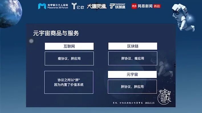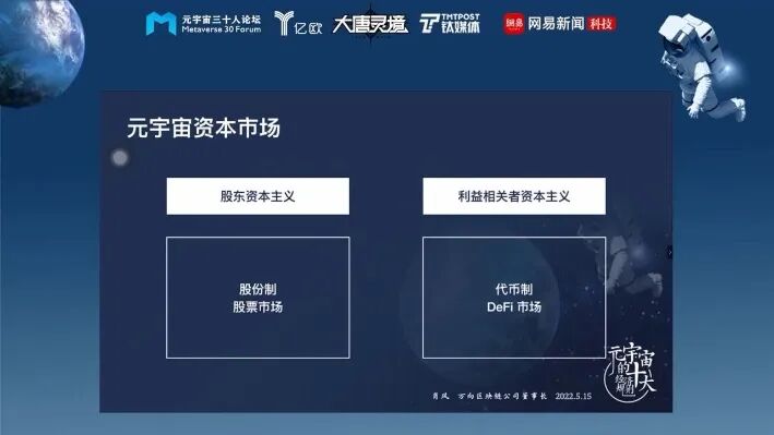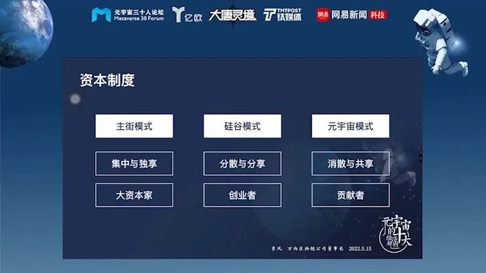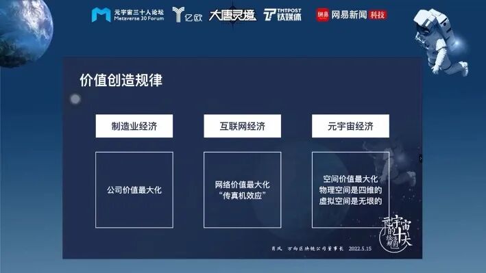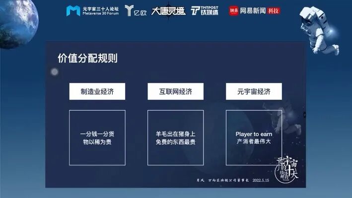 第二屆全球元宇宙大會暨元宇宙三十人論壇成立大會5月15日在線上成功召開,萬向區塊鏈董事長、元宇宙三十人論壇理事會聯席理事長肖風先生出席會議并發表主題演講。以下為演講全文:熱烈祝賀元宇宙三十人論壇今天正式成立,我要分享的題目叫做“元宇宙的十大經濟規則”。大家知道元宇宙應該是小荷才露尖尖角,現在我們去討論元宇宙的經濟規則,肯定有很大一部分是在猜想。所以,里面肯定會有很多在未來被證明不對的地方。但是我堅信一點,元宇宙的經濟規則一定會不同于互聯網的經濟規則,就好像互聯網的經濟規則不同于制造業的經濟規則,一定會有不同。我們大家一起共同探討不同在哪里。首先,從產權制度和資本收益分配制度的角度來說。過去我們可以粗略地劃分為三種模式。工業經濟模式或者制造業經濟模式叫做“主街模式”,“主街”本來是對應著華爾街,華爾街是金融資本,主街是工業資本、產業資本。主街模式從產權股權角度看是集中的,同時資本的收益是獨享的。那個階段會有很多的大資本家,福特、卡耐基、洛克菲勒等主街的大資本家。但是到了“硅谷模式”,也可以稱之為信息經濟模式,產權是分散的,創始人、A、B、C輪融資,同時很多股權以員工期權的方式分配給員工,因為它的股權結構是分散的,所以硅谷模式下不會有大資本家,大部分都是職業經理人,有創始人+職業經理人,很難出現卡耐基、洛克菲勒這樣的大資本家。從資本收益角度來說,也從獨享變成為分享,這是分散的資本結構和分享的資本收益。在元宇宙經濟體系里面,所謂的股權制度就被消散了,不一定存在了,或者即使存在,它的價值也被大幅度消減。從資本收益角度來看,它是共享的模式。所有的貢獻者、參與者大家以利益相關者的組織方式,通過智能合約實現大規模協作,從而共享元宇宙所實現的價值,這是我想說的資本制度方面可能會有不同。第二,從價值創造的規律來說,制造業經濟、互聯網經濟和元宇宙經濟也是不同的。制造業經濟,價值創造規律是要使公司價值最大化。到了互聯網時代,已經不是追求公司價值最大化,而是追求網絡價值最大化。凱文凱利舉過一個例子,叫“傳真機效應”。200美元買了一臺傳真機這是成本,但是你加入了傳真機網絡,可以向別人發傳真,別人也可以向你發傳真。你享用的網絡的價值可能價值數百億美元,遠遠大于買傳真機付出的成本。互聯網先追求“網絡價值最大化”,從而實現你本身的價值最大化。另外,你上午買了一臺傳真機,下午另外一群人買了傳真機,下午那群人買的傳真機對你的價值也有增加,因為你有了更多的發傳真的選擇。傳真機效應非常好地解釋了互聯網,大家追求網絡價值的最大化。到元宇宙里面,元宇宙是一個空間概念,數字空間、虛擬世界、平行宇宙。在追求網絡價值最大化的基礎上,更進一步追求整個空間價值最大化。尤其是在虛擬空間,不受到很多物理規則的限制,可以有更大發展空間,大家要想方設法在虛擬世界、數字空間、平行宇宙,創造價值,追求它的價值最大化。第三,從價值分配角度來說。制造業具有固定成本高、邊際成本遞增的特點,所以,造1臺車和造100臺車,每多造一臺車邊際成本在增加。所以制造業經濟的定價模式基本是以成本加成,加利潤率,來給制造業的產品定價,我們可以把它叫做“收費模式”。制造業不可能有免費的模式,一定是收費模式,或者以收費模式為核心模式。到了互聯網時代,是以“免費模式”作為主要的模式,因為互聯網經濟具有高固定成本,但是它的邊際成本基本為零。所以可以“羊毛出在豬身上,由狗來買單”。看上去免費,但實際上免費的東西可能更貴,可能比“物以稀為貴”制造業的規則還要貴。制造業企業最高是幾千億美元市值,到了互聯網時代可以出現幾萬億美元的市值,因為你的邊際成本為零,賺得更多。元宇宙是否是這樣的模式?不是。元宇宙由于資本的消散,資本收益共享,所有參與者共享。因此,元宇宙是產、消者結合在一起。所以,我借用目前元宇宙商業里面很熱的一個詞“X to Earn”(邊玩邊賺、邊運動邊賺等等),把它改造為“Player to Earn”(玩家、參與者或者“利益相關者”賺取回報,共同分配元宇宙的價值)。第四、第五,從Player to Earn之“player”和 Player to Earn之“earn”角度來說。player就是元宇宙經濟里面的利益相關者,包括開發者、創造者、貢獻者、消費者、投資者,所有的參與者都是元宇宙的player。NFT是元宇宙所有資產的標志物,一般等價物,當在元宇宙里面創造、發行、經營、運用、交易NFT的時候,實際就是player在元宇宙里面經營這塊資產。經營元宇宙的資產,就是player在元宇宙里面干的事情,經營NFT資產賺錢。“earn”怎么定義?player創造、經營、運用元宇宙資產來賺取回報,賺來的回報是以代幣的格式表示的,所以賺的是Token。整個元宇宙的基本商業邏輯是“player NFT”,然后賺取(earn)Token,區塊鏈作為分布式賬本,就是為這種Player to Earn記賬用的。我們現在已經看見一些Player to Earn的應用場景出現了,但是只是小荷才露尖尖角。我覺得以后元宇宙基本就是這樣的核心商業邏輯。第六,從元宇宙資本市場的角度來講,元宇宙的資本市場和現在所熟悉的資本市場完全不同,這個世界將來會存在兩套資本市場體系。一套是以工業經濟和互聯網經濟的股權