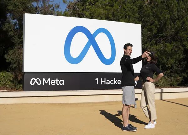 今年10月,美國社交媒體巨頭臉書宣布更名為“元”(Meta),聚焦元宇宙。圖為在美國舊金山灣區,人們在“元”標志牌前留影。(圖片來源:新華社)