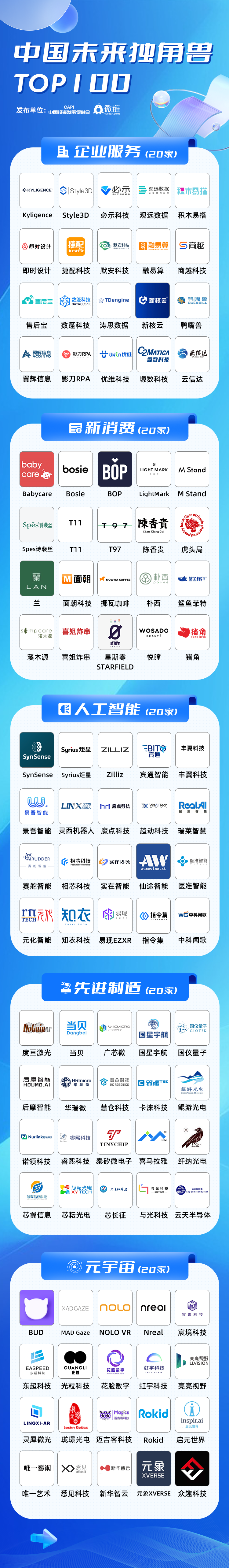 近日,在第六屆萬物生長大會·中國未來獨角獸大會上,《2022中國未來獨角獸TOP100榜單》正式發布。榜單聚焦企業服務、人工智能、新消費、先進制造、元宇宙5大領域,尋找未來產業新生創新力,一同探索中國“四新”力量。