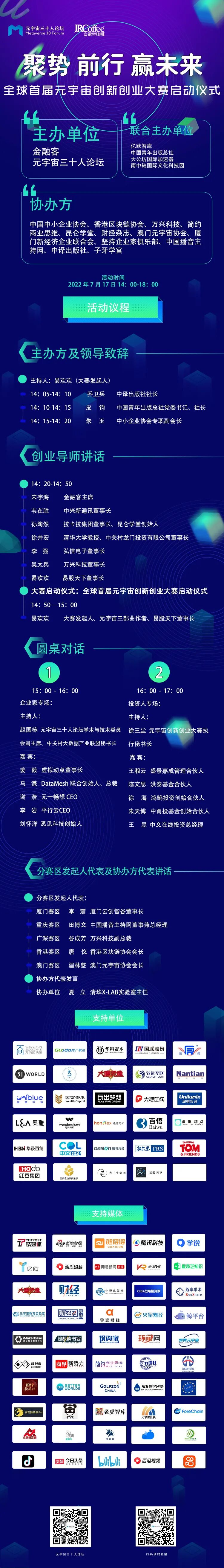 為落實《“十四五”數字經濟發展規劃》和國家關于創新創業的政策方針,推進產業數字化轉型升級與新一代信息技術應用創新,激發元宇宙相關產業創新活力,推動元宇宙產業的發展,由元宇宙第一智庫——元宇宙三十人論壇與金融客共同主辦的“全球首屆元宇宙創新創業大賽”將于2022年7月17日正式啟動,并同時舉辦閉門研討會。