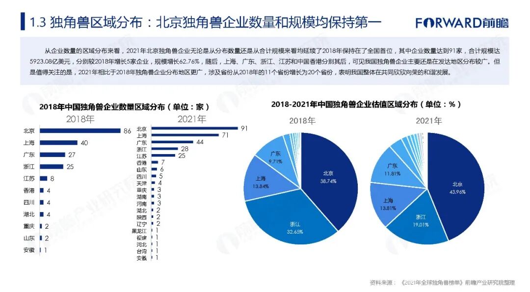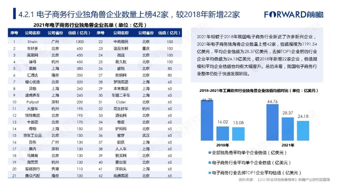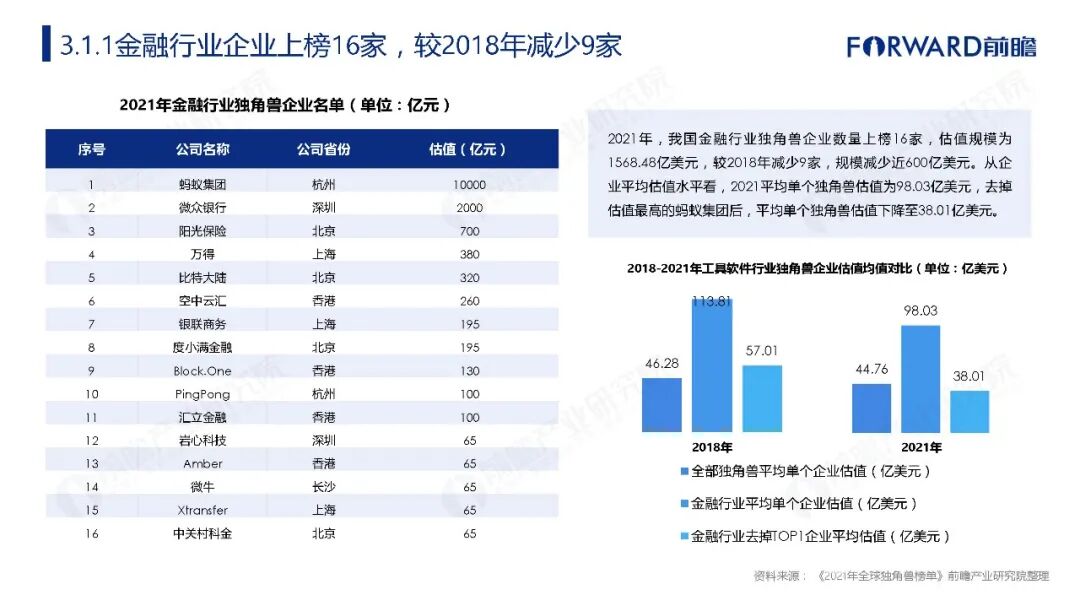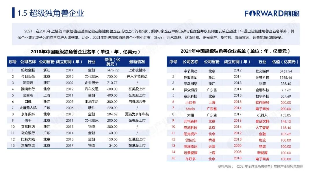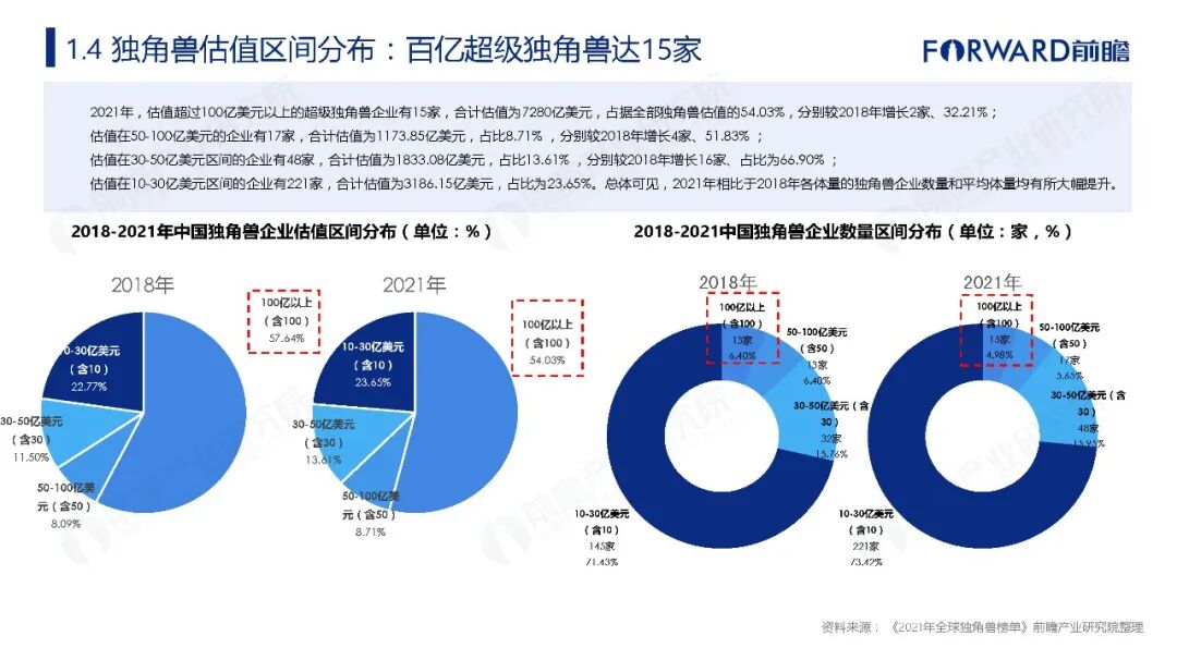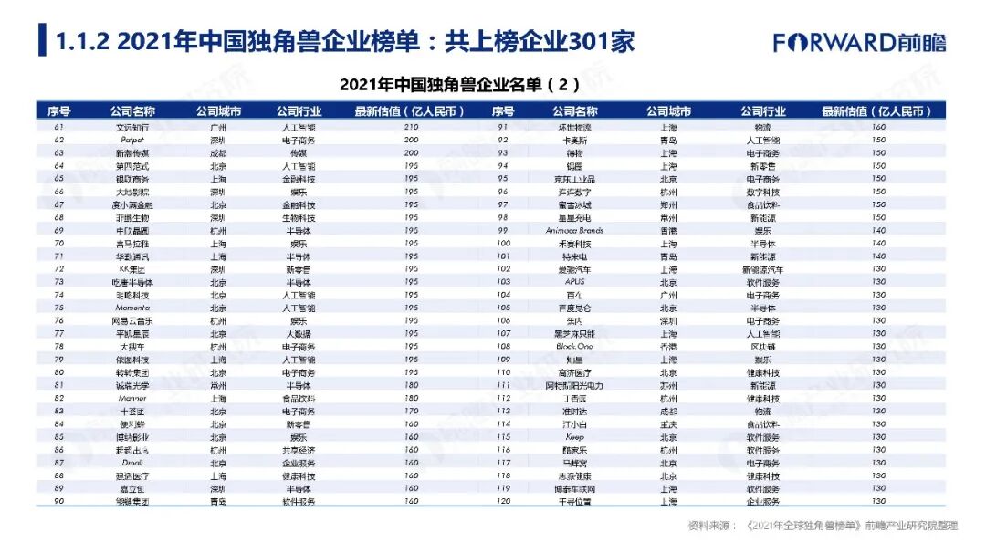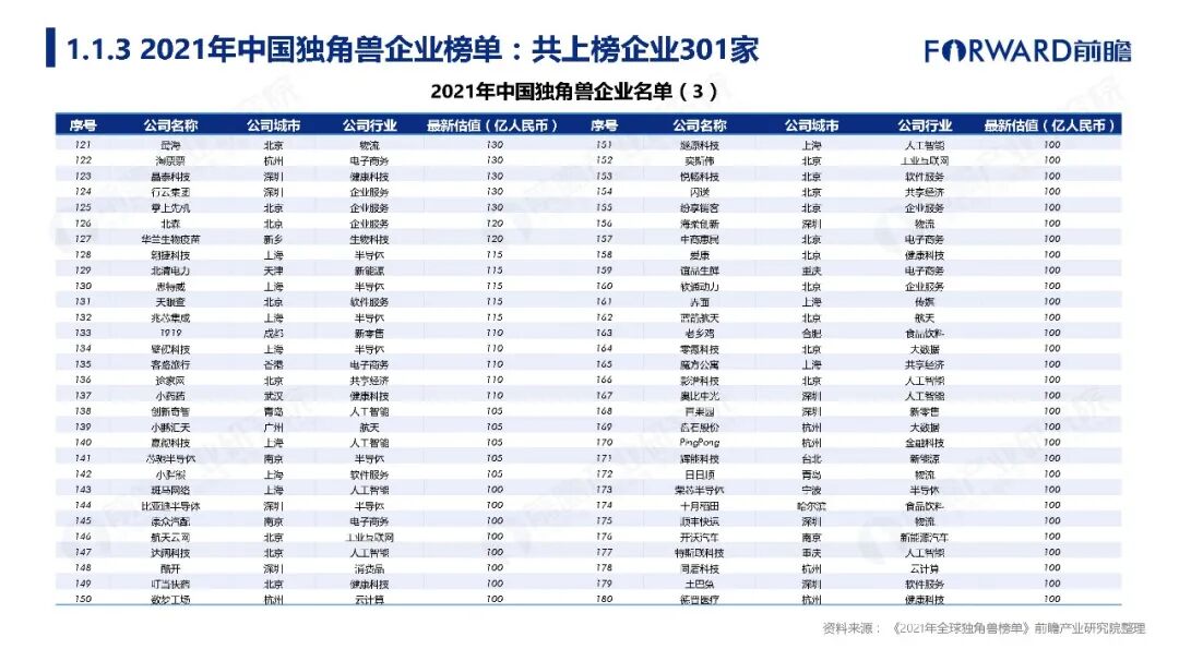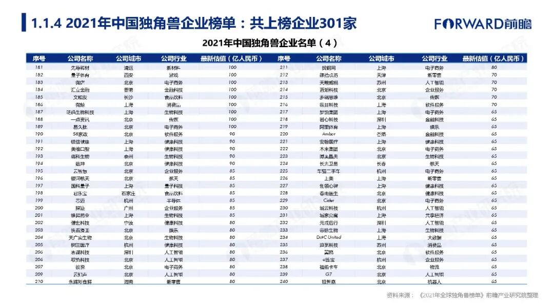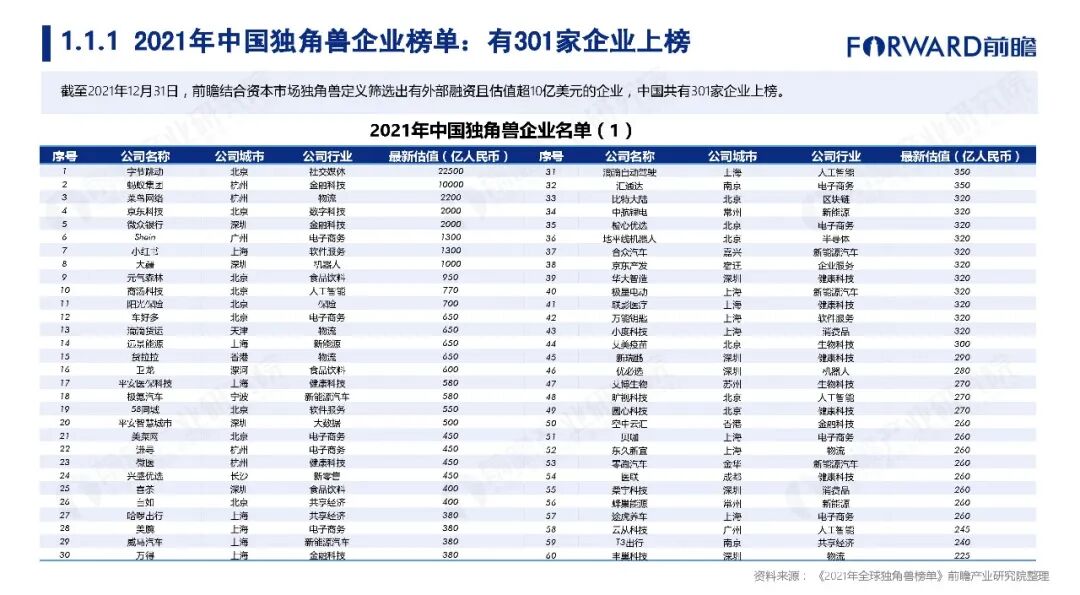 截至2021年12月31日,前瞻結合資本市場獨角獸定義篩選出有外部融資且估值超10億美元的企業,中國共有301家企業上榜。目前,從企業數量的行業分布來看,相比于2018年,2021年中國獨角獸企業分布的行業更多,較2018年新增加12個細分行業。從行業分布數量和行業估值來看,2021年相比于2018年增長較快的行業有本地生活行業、工具軟件行業、人工智能行業、生物科技行業和新能源行業,無論是企業數量還是估值規模都有較大提升;相比之下,金融行業和教育行業相比于2018年有一定的沒落,其中教育行業2021年更是沒有一家獨角獸企業;除了以上行業,電子商務、企業服務、醫療健康等熱門行業仍保持著高度景氣;此外,相比于2018年,2021年獨角獸企業排名中還新增了涉及新材料、量子科技等高科技行業的企業。為此,前瞻產業研究院《2021年中國獨角獸企業研究報告》,對中國301家獨角獸企業概況以及行業分析進行深度解析。