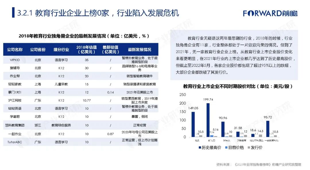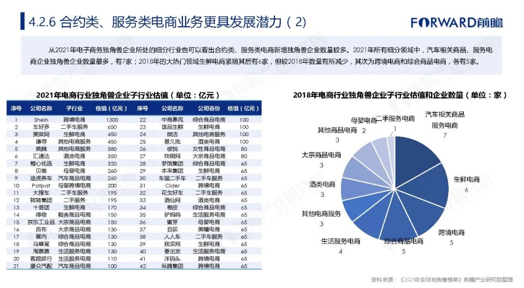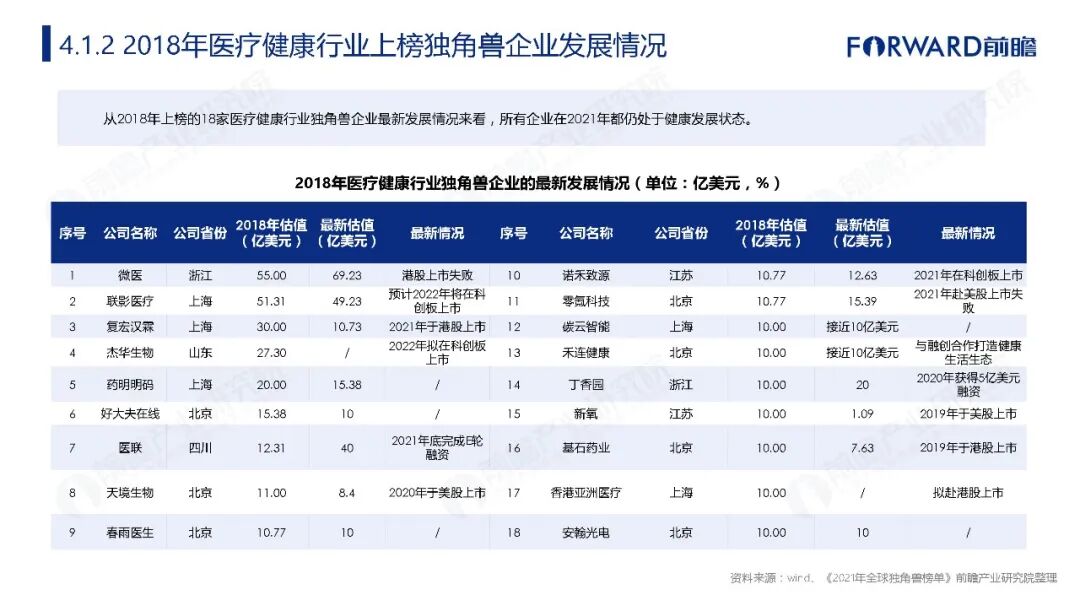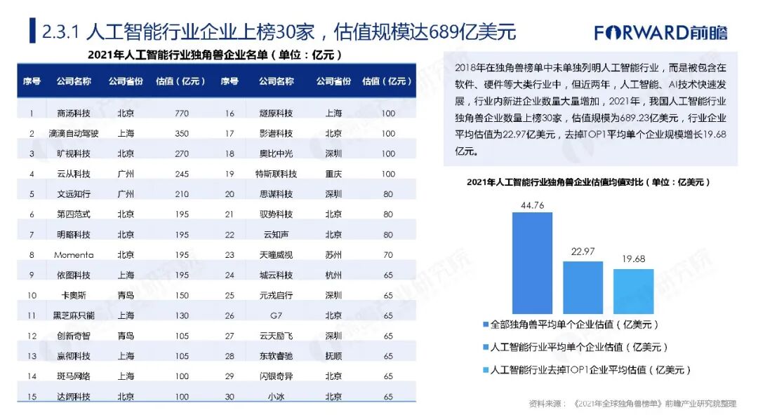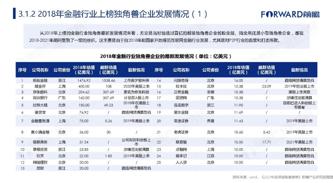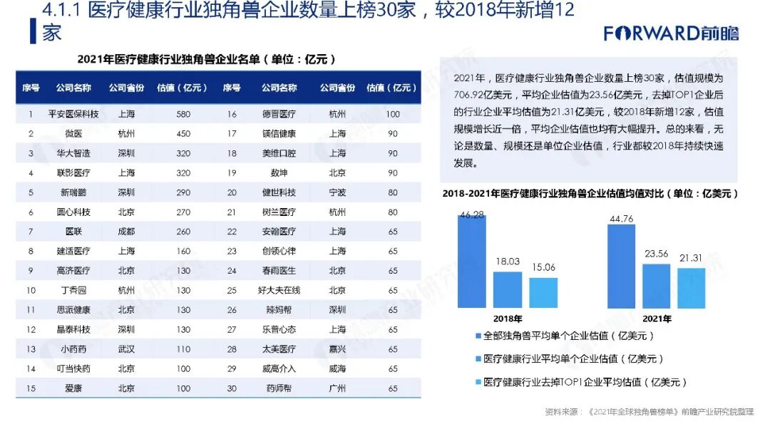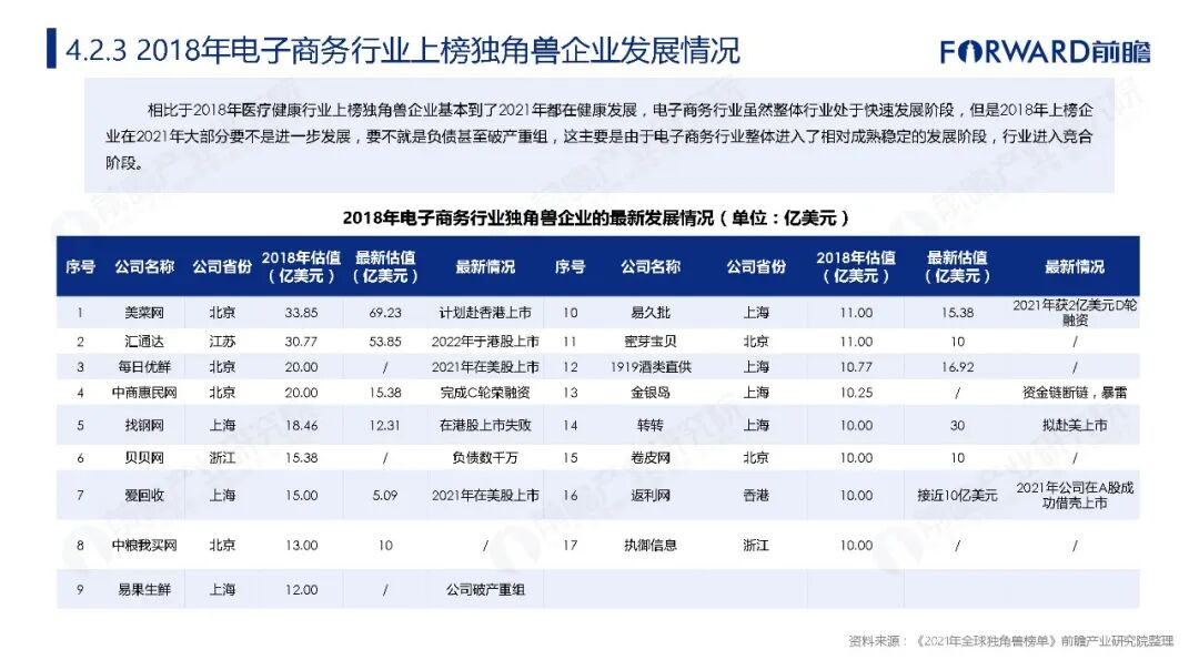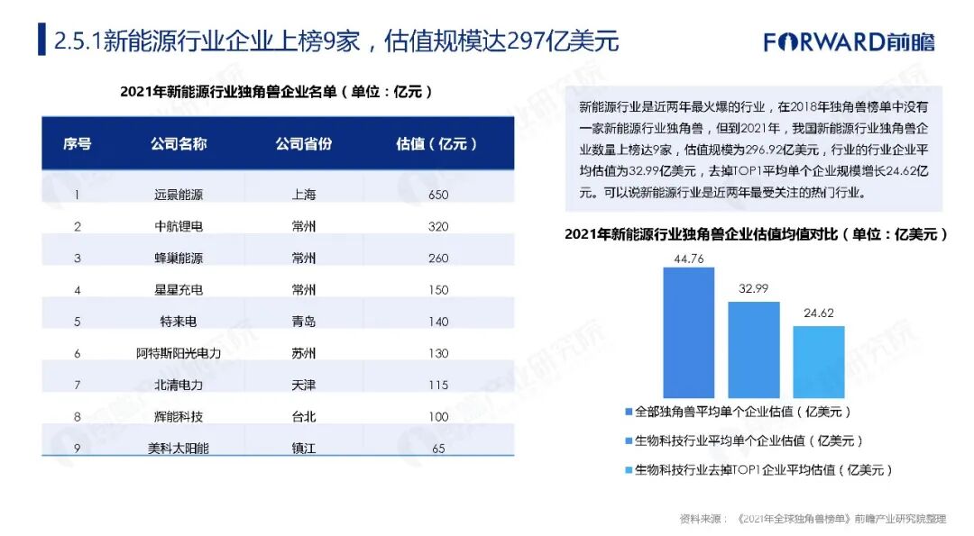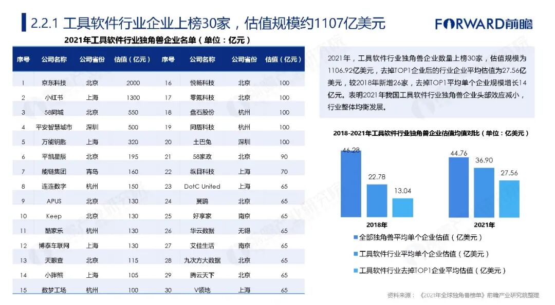 截至2021年12月31日,前瞻結合資本市場獨角獸定義篩選出有外部融資且估值超10億美元的企業,中國共有301家企業上榜。目前,從企業數量的行業分布來看,相比于2018年,2021年中國獨角獸企業分布的行業更多,較2018年新增加12個細分行業。從行業分布數量和行業估值來看,2021年相比于2018年增長較快的行業有本地生活行業、工具軟件行業、人工智能行業、生物科技行業和新能源行業,無論是企業數量還是估值規模都有較大提升;相比之下,金融行業和教育行業相比于2018年有一定的沒落,其中教育行業2021年更是沒有一家獨角獸企業;除了以上行業,電子商務、企業服務、醫療健康等熱門行業仍保持著高度景氣;此外,相比于2018年,2021年獨角獸企業排名中還新增了涉及新材料、量子科技等高科技行業的企業。為此,前瞻產業研究院《2021年中國獨角獸企業研究報告》,對中國301家獨角獸企業概況以及行業分析進行深度解析。