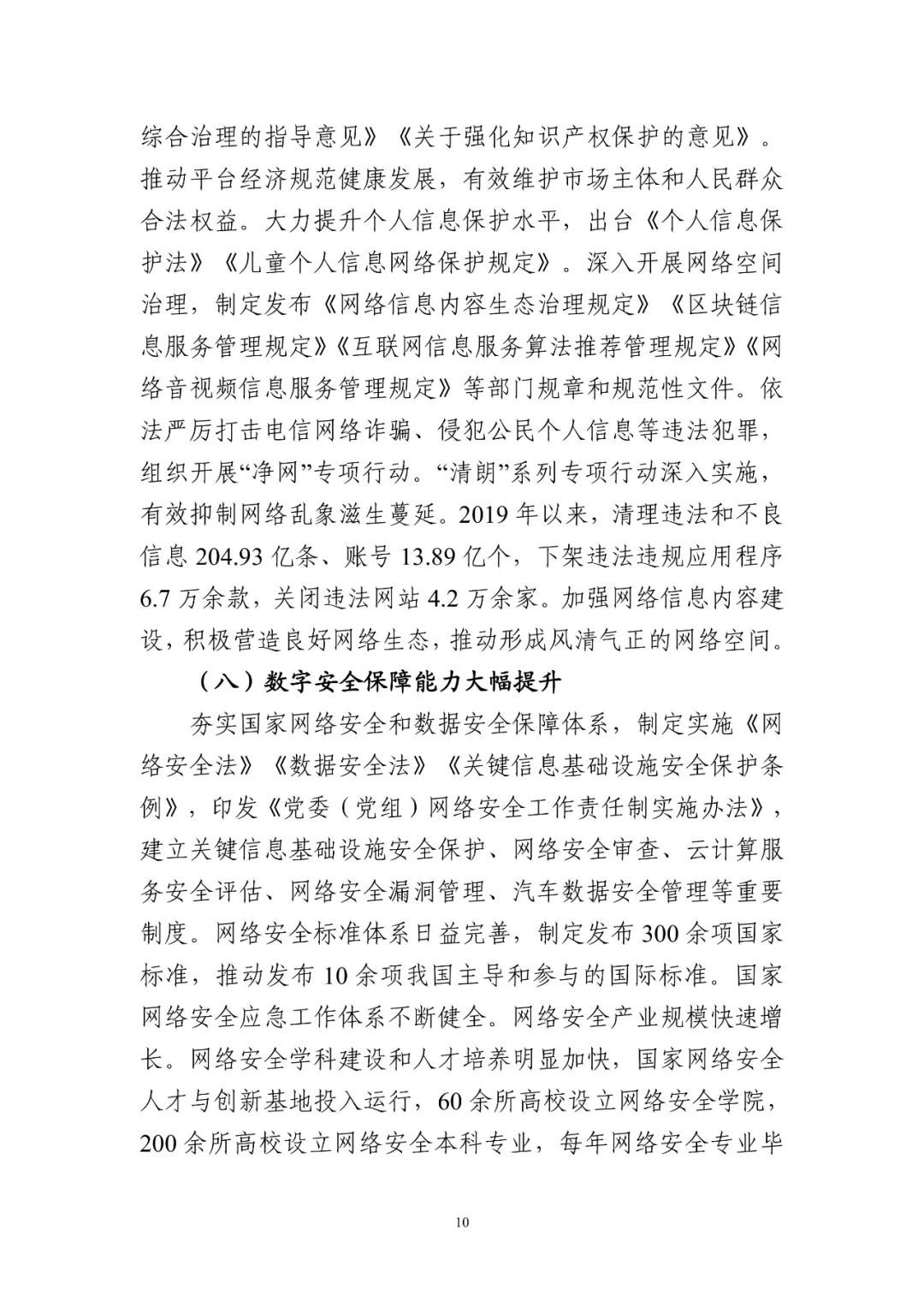 法律法規體系加快健全完善,《電子商務法》《網絡安全法》《數據安全法》《個人信息保護法》《關鍵信息基礎設施安全保護條例》等制定實施。制定發布《網絡信息內容生態治理規定》《區塊鏈信息服務管理規定》《互聯網信息服務算法推薦管理規定》等。推動平臺經濟規范健康發展,有效維護市場主體和人民群眾合法權益。“清朗”系列專項行動深入實施,營造了良好的網絡生態。