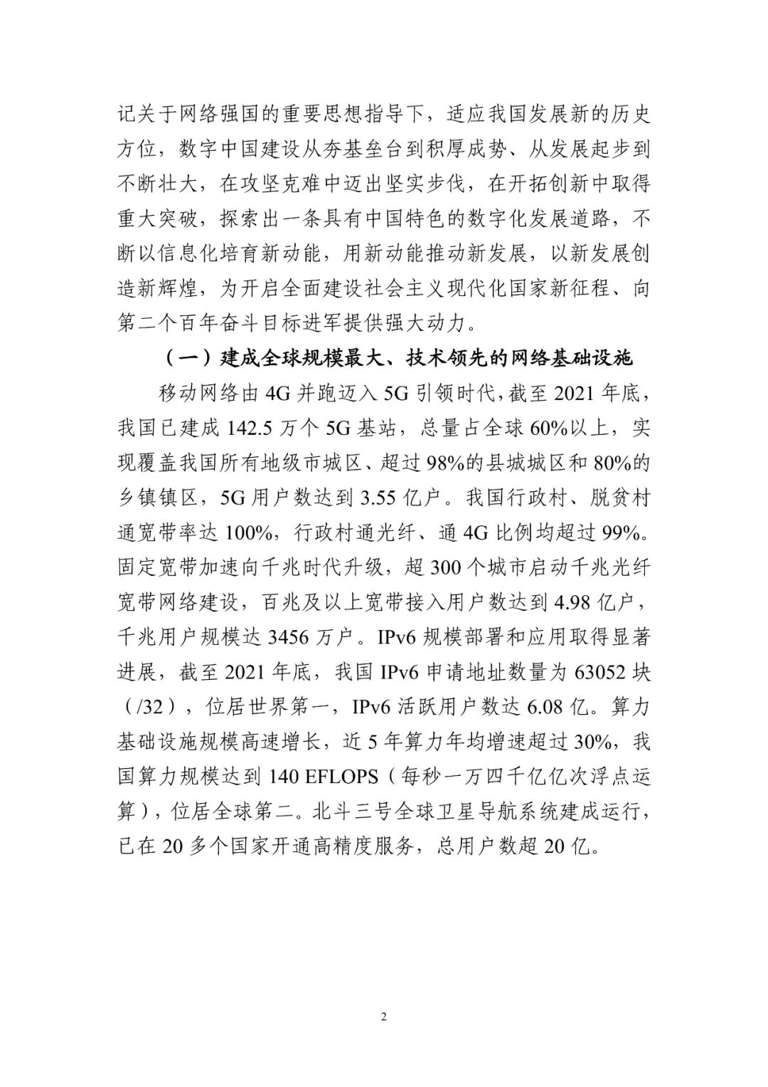 截至2021年底,我國已建成142.5萬個5G基站,總量占全球60%以上,5G用戶數達到3.55億戶,千兆用戶規模達3456萬戶,行政村、脫貧村通寬帶率達100%。截至2021年底,IPv6地址資源總量位居世界第一,IPv6活躍用戶數達6.08億。算力規模全球排名第二,近5年算力年均增速超過30%。