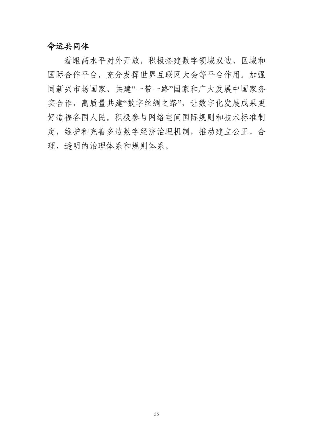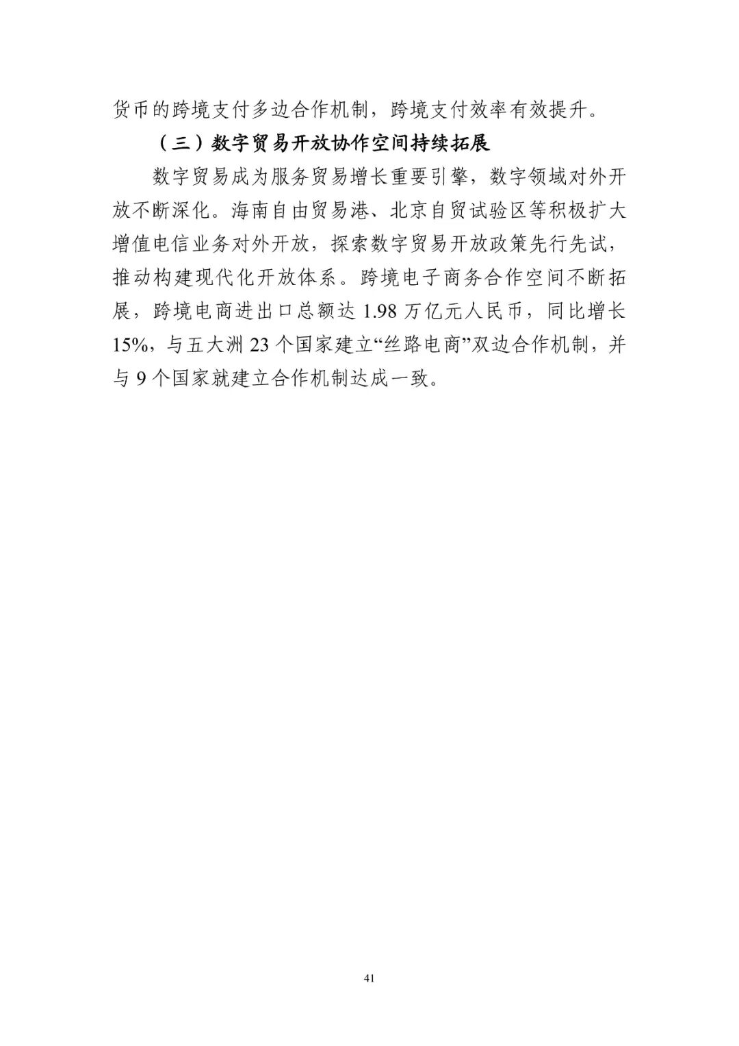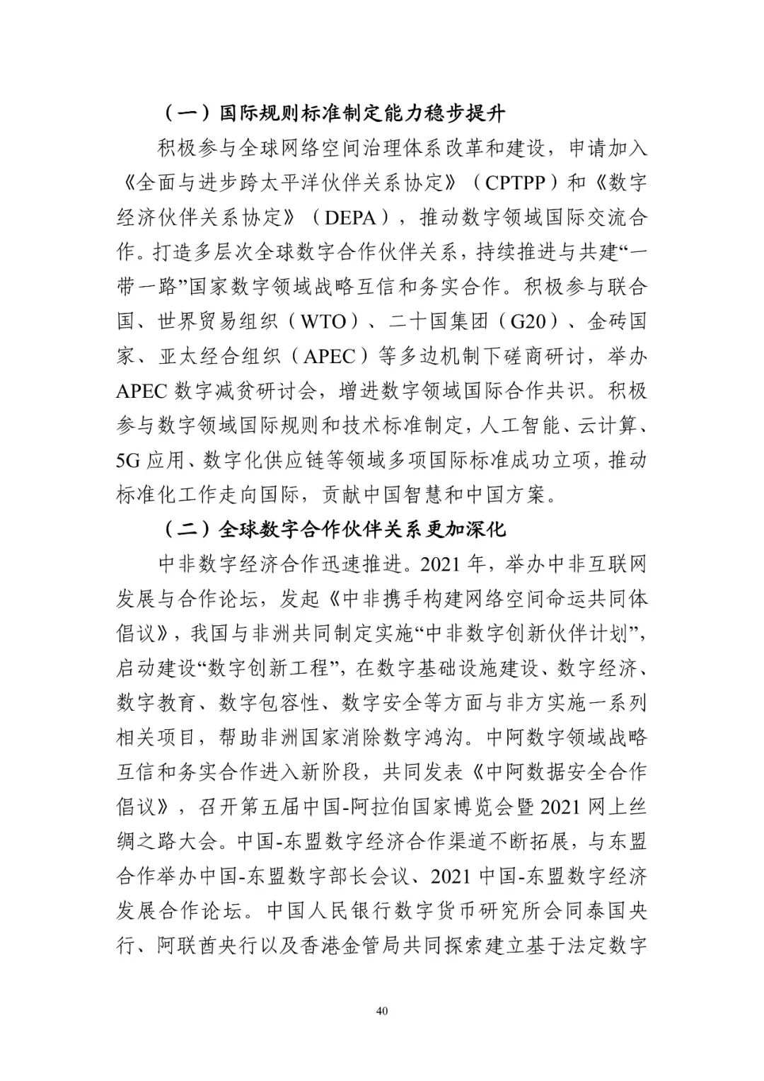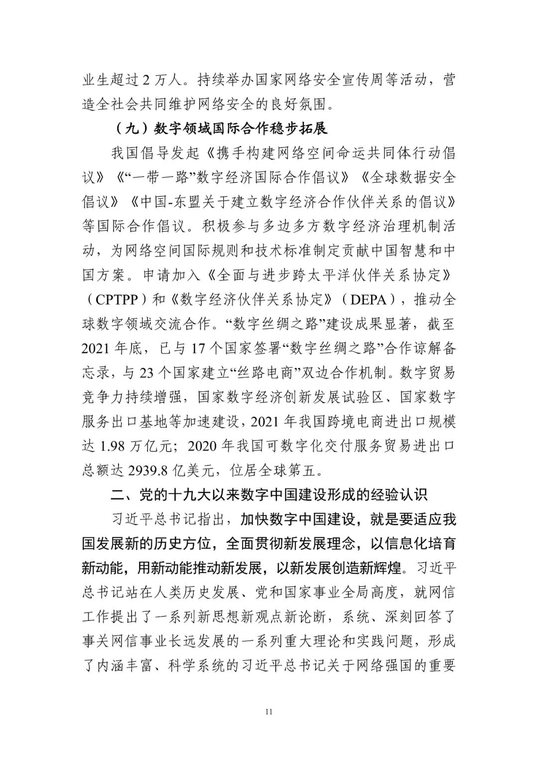 我國倡導發起《攜手構建網絡空間命運共同體行動倡議》《“一帶一路”數字經濟國際合作倡議》等國際合作倡議。積極參與多邊多方數字經濟治理機制活動,為網絡空間國際規則和技術標準制定貢獻中國智慧和中國方案。申請加入《全面與進步跨太平洋伙伴關系協定》(CPTPP)和《數字經濟伙伴關系協定》(DEPA)。“數字絲綢之路”建設成果顯著,已與17個國家簽署“數字絲綢之路”合作諒解備忘錄,與23個國家建立“絲路電商”雙邊合作機制,數字貿易競爭力持續增強。