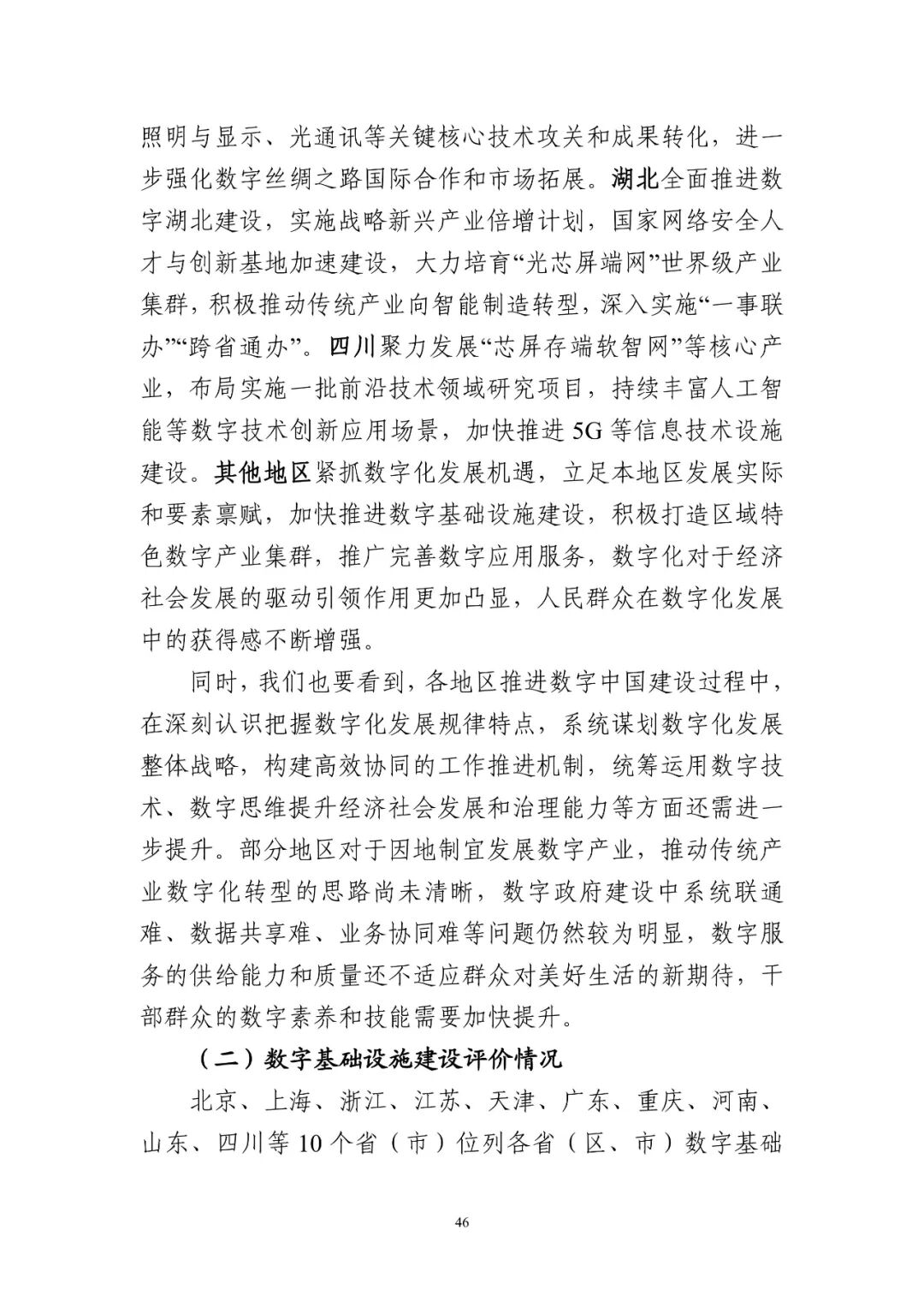 此外,《報告》重點評估了31個省(區、市)在數字基礎設施、數字技術創新、數字經濟、數字政府、數字社會、網絡安全和數字化發展環境方面的發展水平。